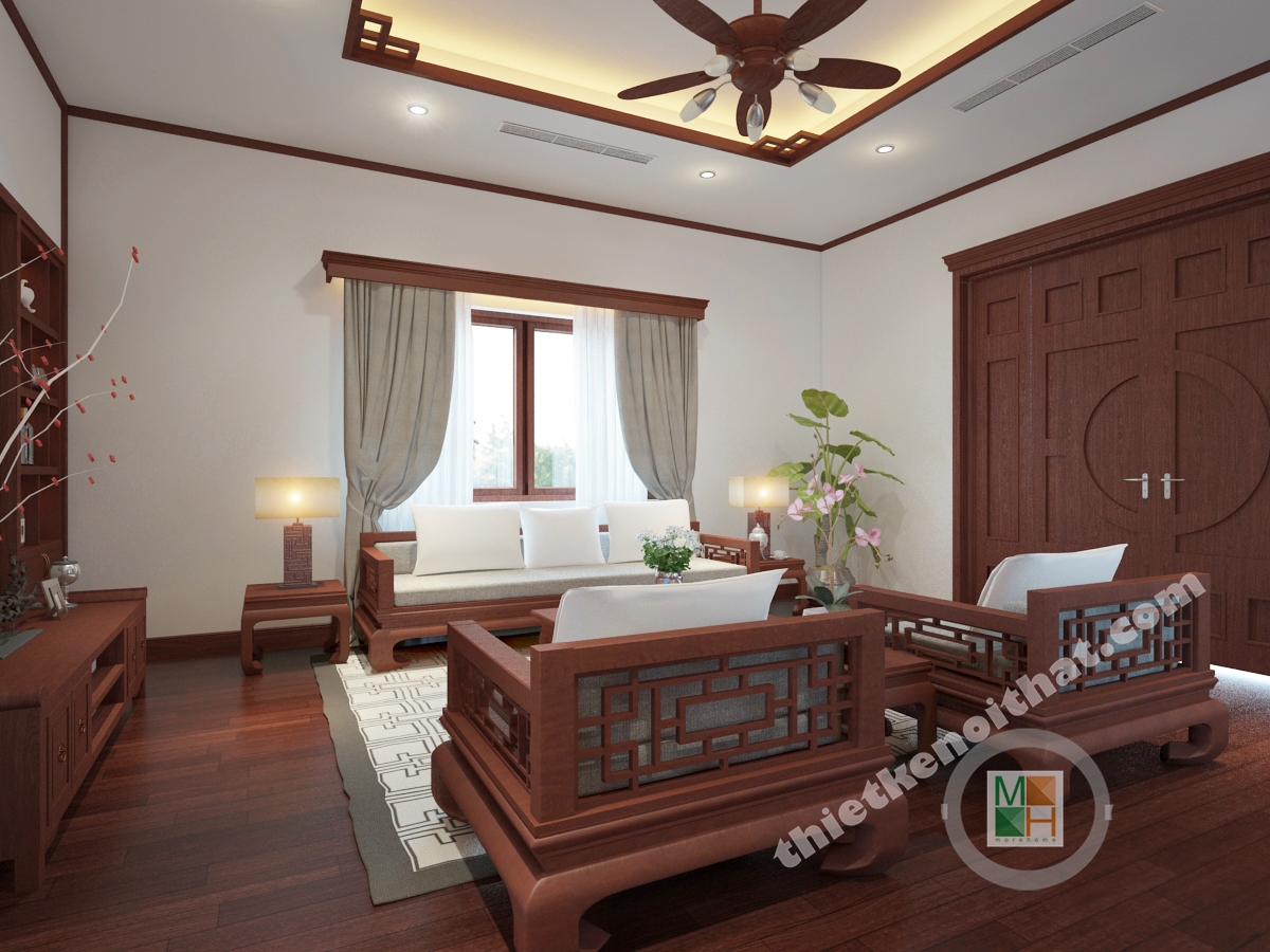 Thiết kế phòng khách liền kề được ngăn cách bằng một vách ngăn gỗ kết hợp tủ đồ. Thiết kế vách ngăn đa năng này vừa giúp giảm thiểu thời gian thi công vừa tạo không gian mở và thoáng hơn nhiều so với việc sử dụng vách tường thô cứng. Ánh sáng tự nhiên được tận dụng tối đa để chiếu sáng cho căn phòng. Điểm nhấn của căn phòng chính là bộ bàn ghế thiết kế tỉ mỉ với các đường nét trạm trổ ấn tượng mang đến một không gian vô cùng sang trọng và cổ điển. Một vài vật dụng trang trí được thêm vào để tạo điểm nhấn theo sở thích của gia chủ như tranh thủy mặc, chậu cây bonsai.