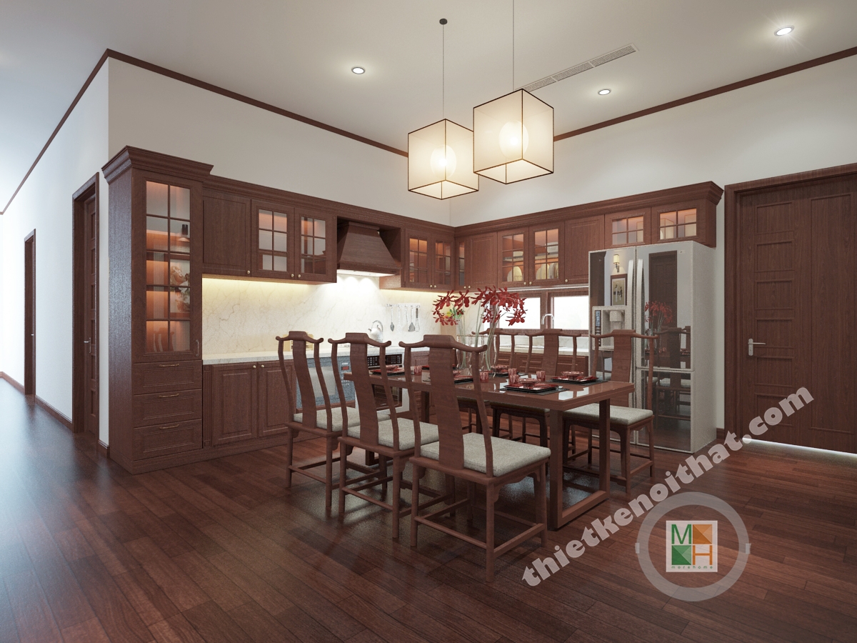Thiết kế phòng ăn hiện đại và sang trọng. Hệ thống tủ bếp bằng gỗ được thiết kế mở rộng tạo không gian thoải mái và thuận tiện hơn so với các thiết kế đóng và quây vòng. Bàn ăn thiết kế hình chữ nhật với các đường nét trang trí đơn giản và truyền thống. Thiết kế khá cứng nhắc nếu không có những nét trang trí nhỏ phá cách như đèn bàn ăn, lọ hoa… Chính vì vậy mà không gian bớt nhàm chán, vừa đảm bảo tính tiện dụng vừa tăng thêm tính thẩm mỹ cho căn phòng.