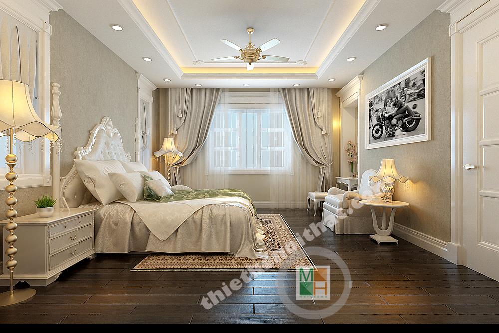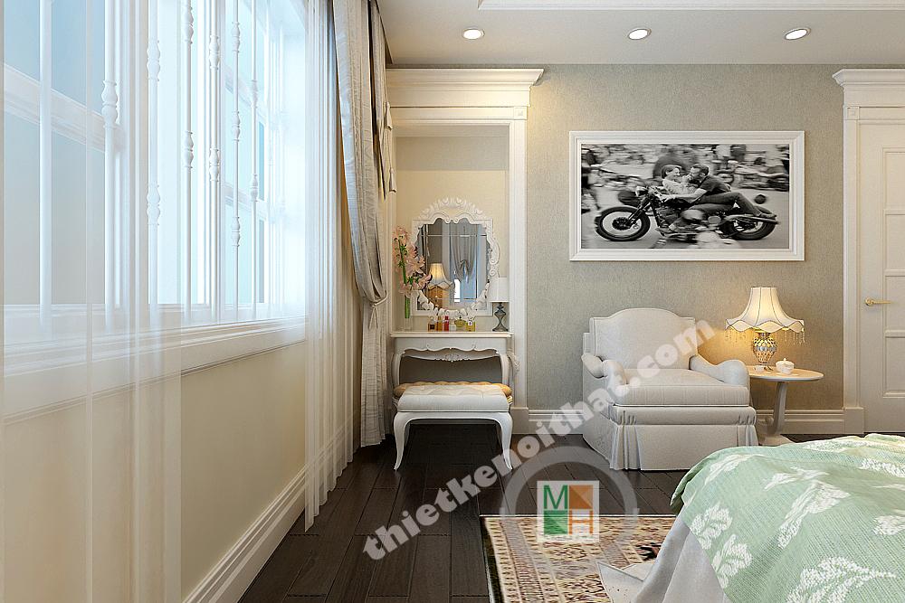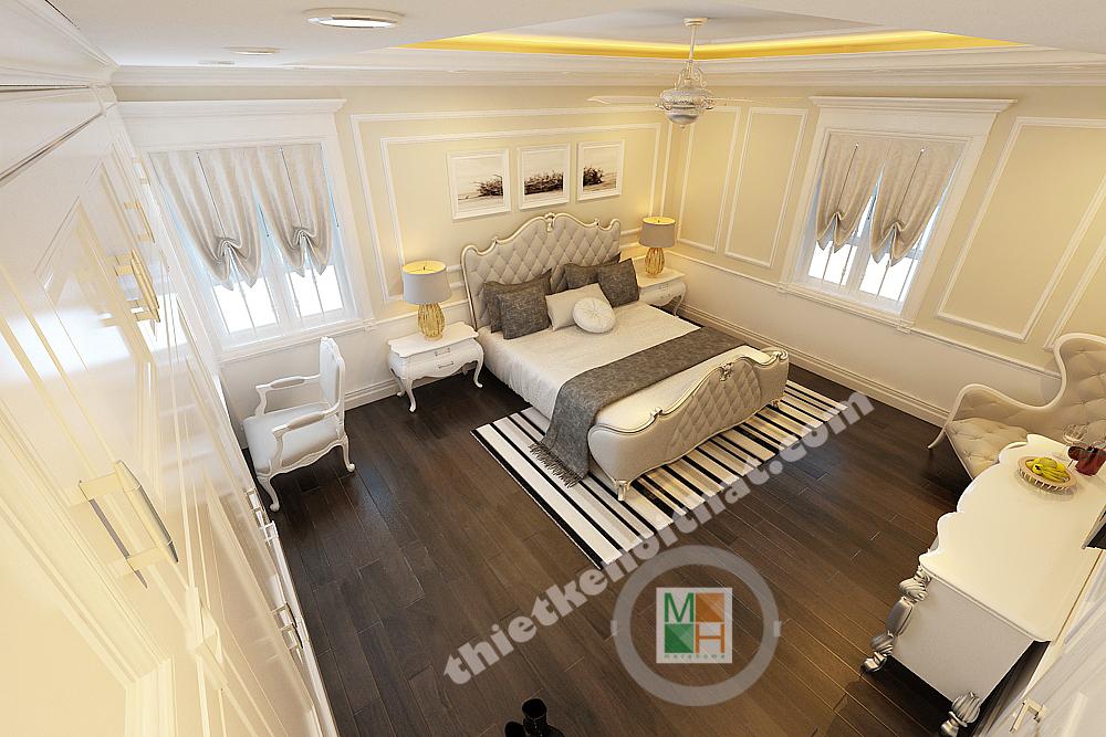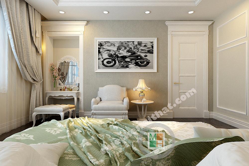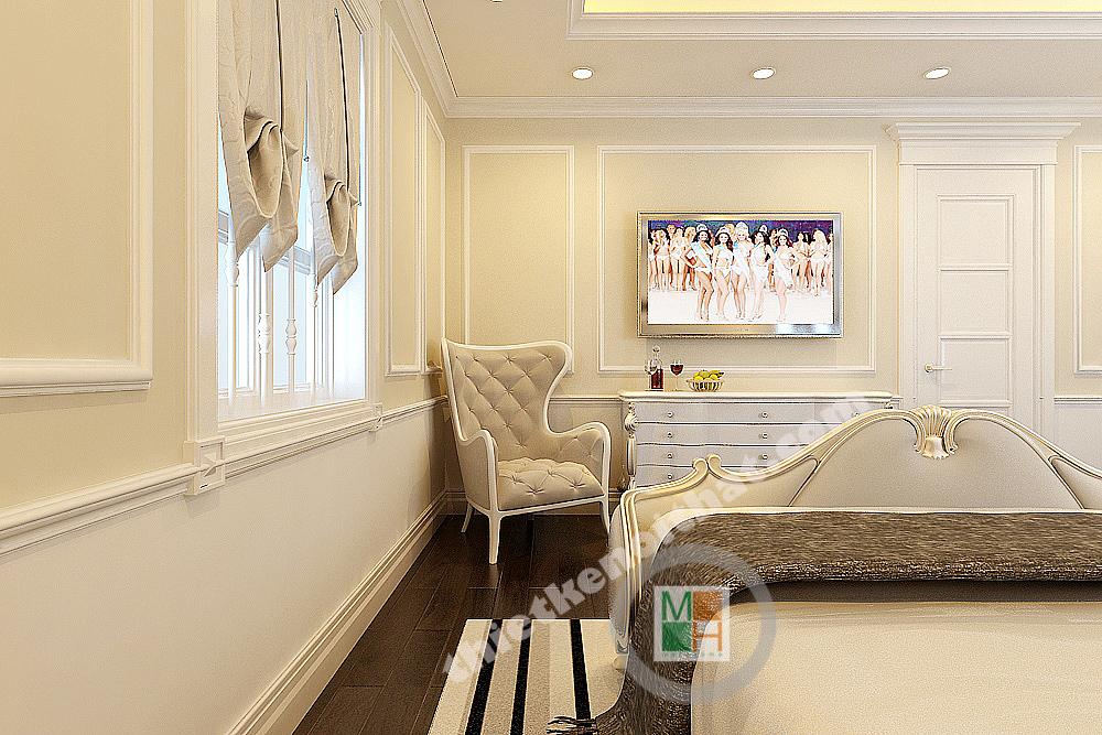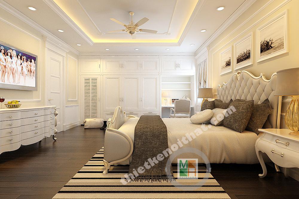 Phòng ngủ chính được trang bị giường ngủ kingsize sang trọng, thể hiện đẳng cấp của gia chủ. Những đường cong mềm mại trên đồ nội thất đem đến một không gian lãng mạn và quyến rũ. Gam màu trắng chủ đạo càng nổi bật và lung linh hơn khi những tia nắng từ hai ô cửa sổ chiếu vào phòng.
