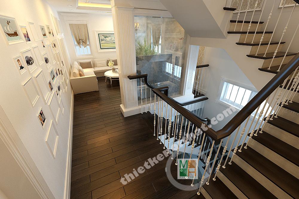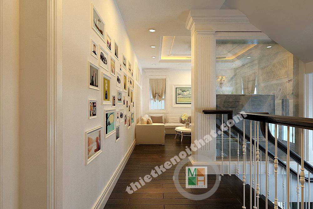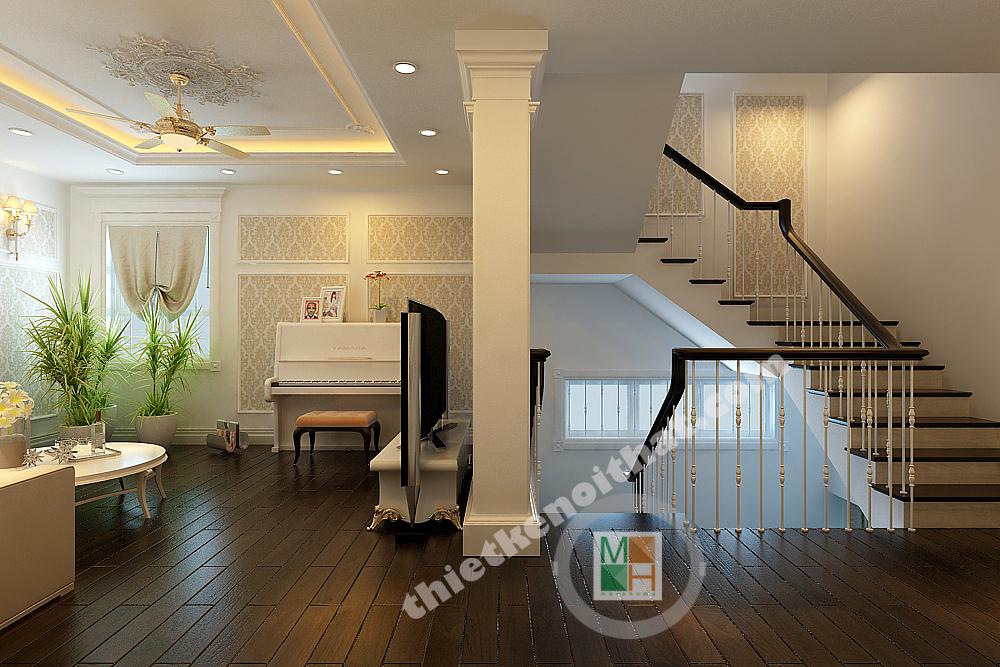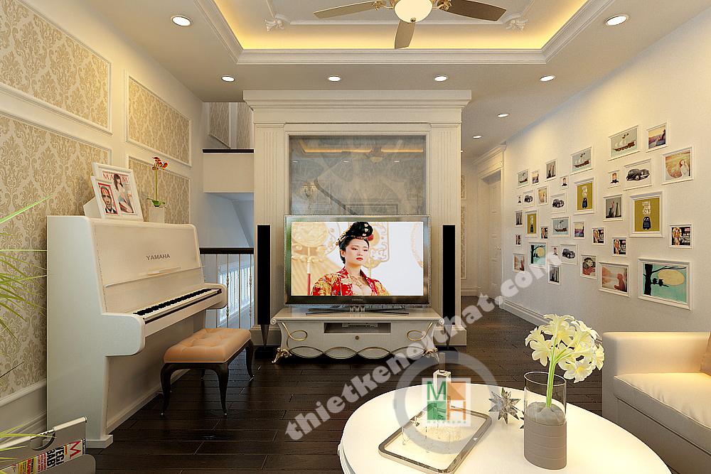Tầng hai vừa là không gian dành cho việc nghỉ ngơi và giải trí của gia đình. Hành lang dài sẽ dẫn bạn vào đến phòng sinh hoạt chung, nơi cả nhà quây quần ngồi xem tivi vào mỗi tối. Chiếc piano kê ở góc phòng ngoài tác dụng chơi nhạc còn có thể xem như một món đồ trang trí độc đáo.
