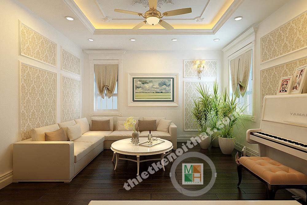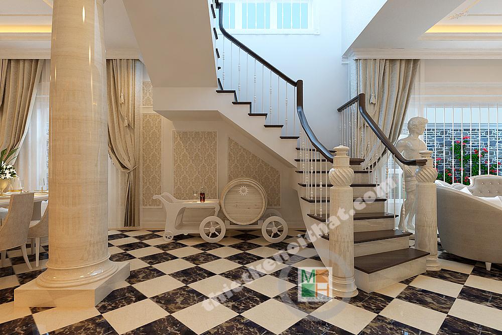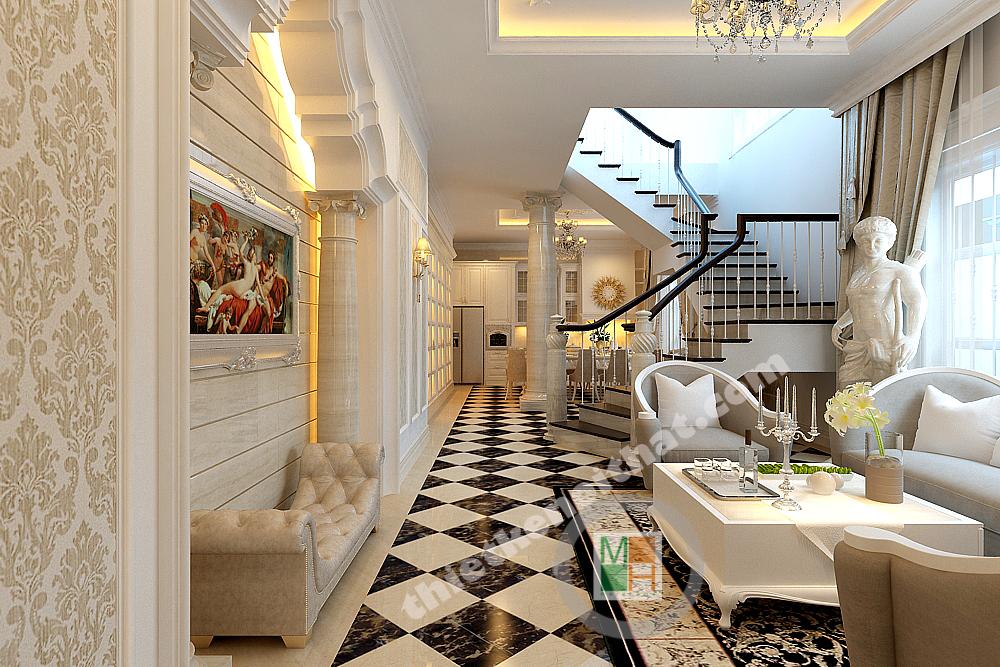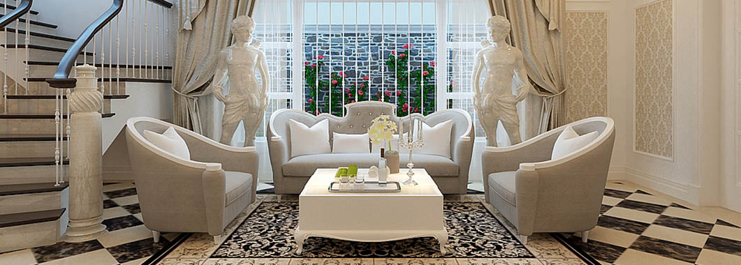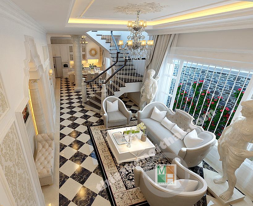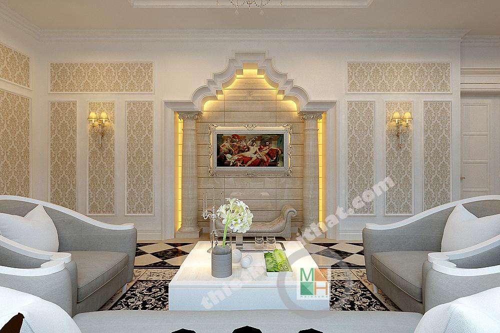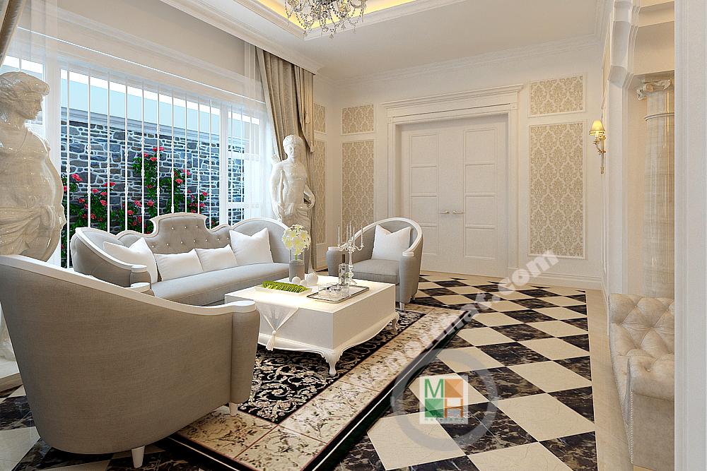 Phòng khách được trang bị bộ sofa bằng vải nỉ sang trọng, bên cạnh là hai bức tượng điêu khắc ấn tượng, tạo cảm giác như đang ngồi trong một cung điện ở Châu Âu. Bàn trà có kích thước trung bình, ngoài việc tiếp khách có thể coi như một món đồ trang trí lịch thiệp trong giới quý tộc. Đối diện nơi tiếp khách là mảng tường trống nên các kiến trúc sư đã thiết kế nó dưới dạng cổng vòm, đặc trưng trong kiến trúc của các công trình châu Âu. Có thể trang trí thêm trên tường bằng một bức tranh phục hưng, thể hiện tâm hồn nghệ thuật của gia chủ.
