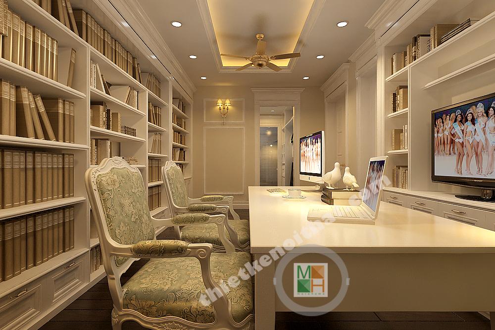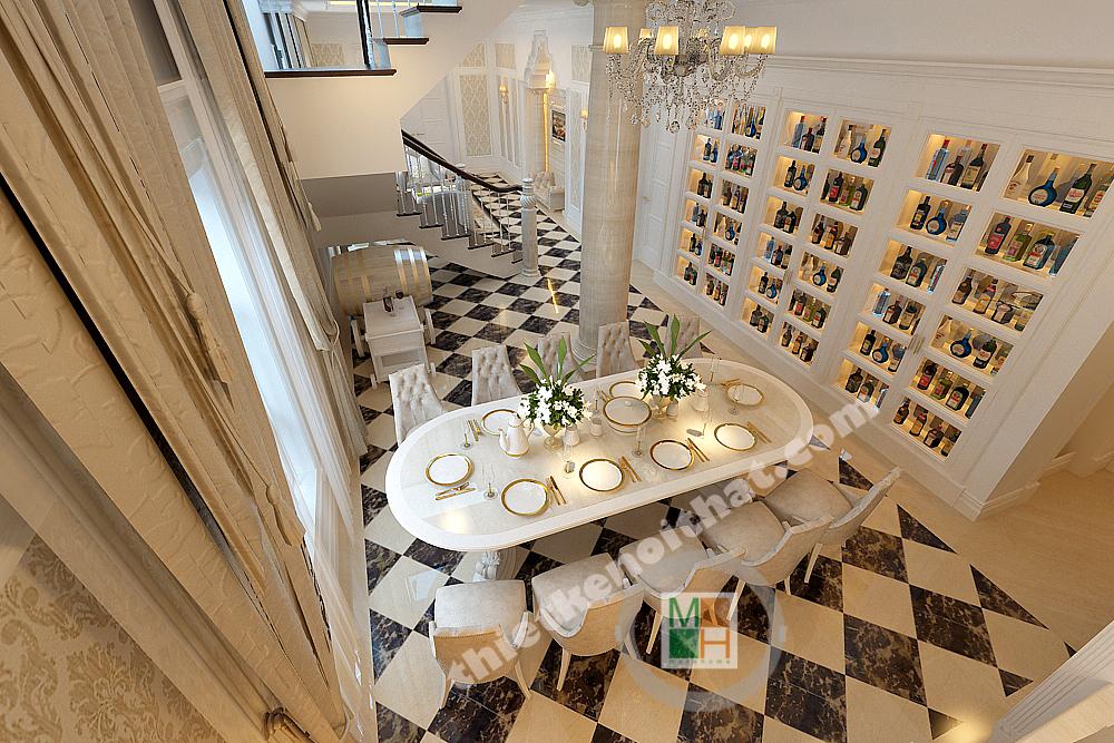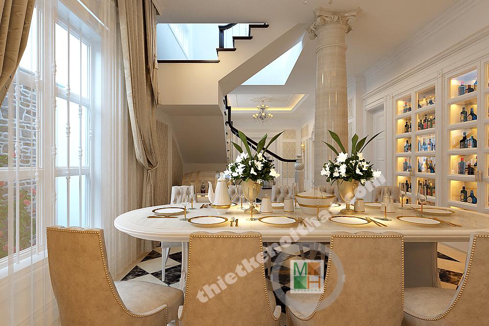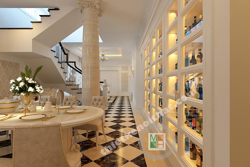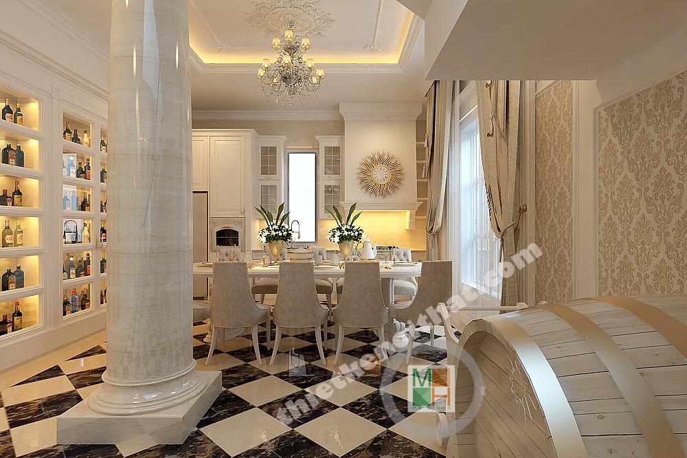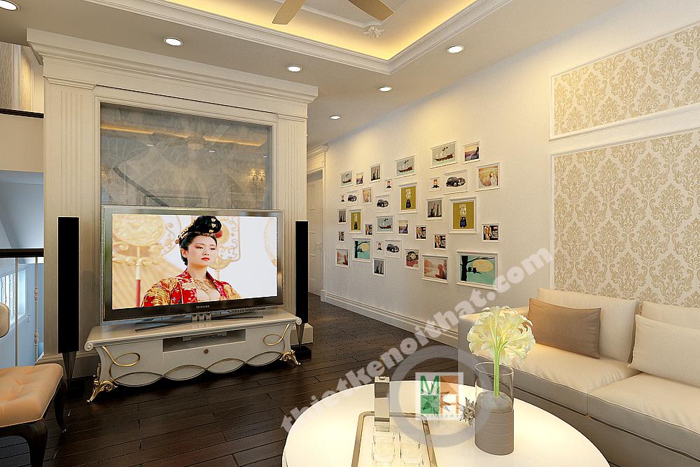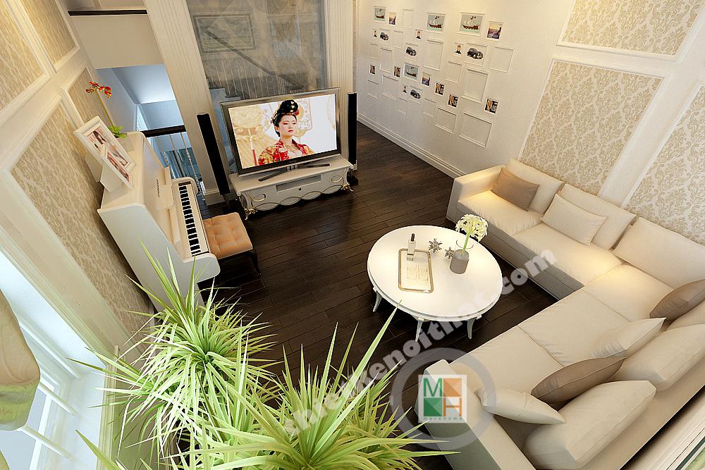 Phòng khách được trang bị bộ sofa bằng vải nỉ sang trọng, bên cạnh là hai bức tượng điêu khắc ấn tượng, tạo cảm giác như đang ngồi trong một cung điện ở Châu Âu. Bàn trà có kích thước trung bình, ngoài việc tiếp khách có thể coi như một món đồ trang trí lịch thiệp trong giới quý tộc. Đối diện nơi tiếp khách là mảng tường trống nên các kiến trúc sư đã thiết kế nó dưới dạng cổng vòm, đặc trưng trong kiến trúc của các công trình châu Âu. Có thể trang trí thêm trên tường bằng một bức tranh phục hưng, thể hiện tâm hồn nghệ thuật của gia chủ.
