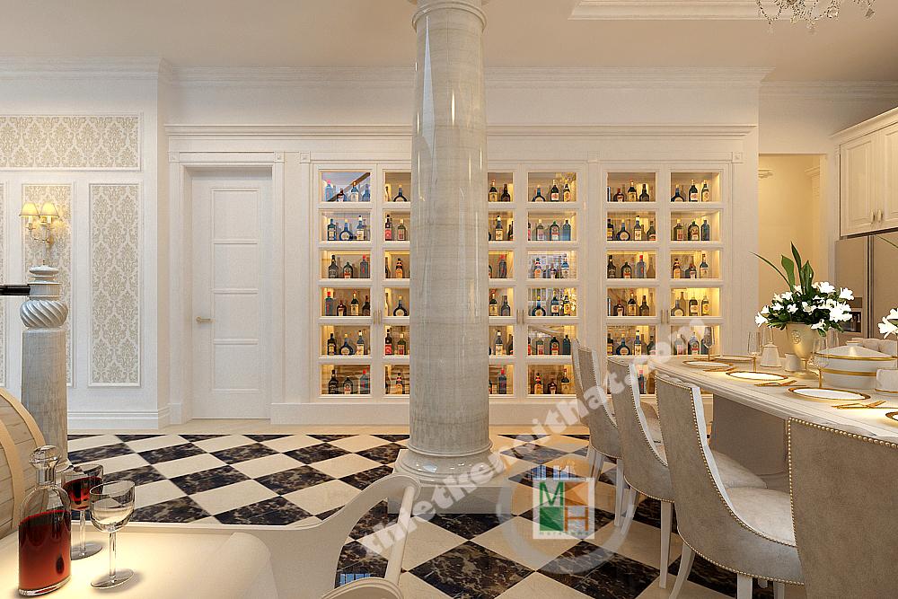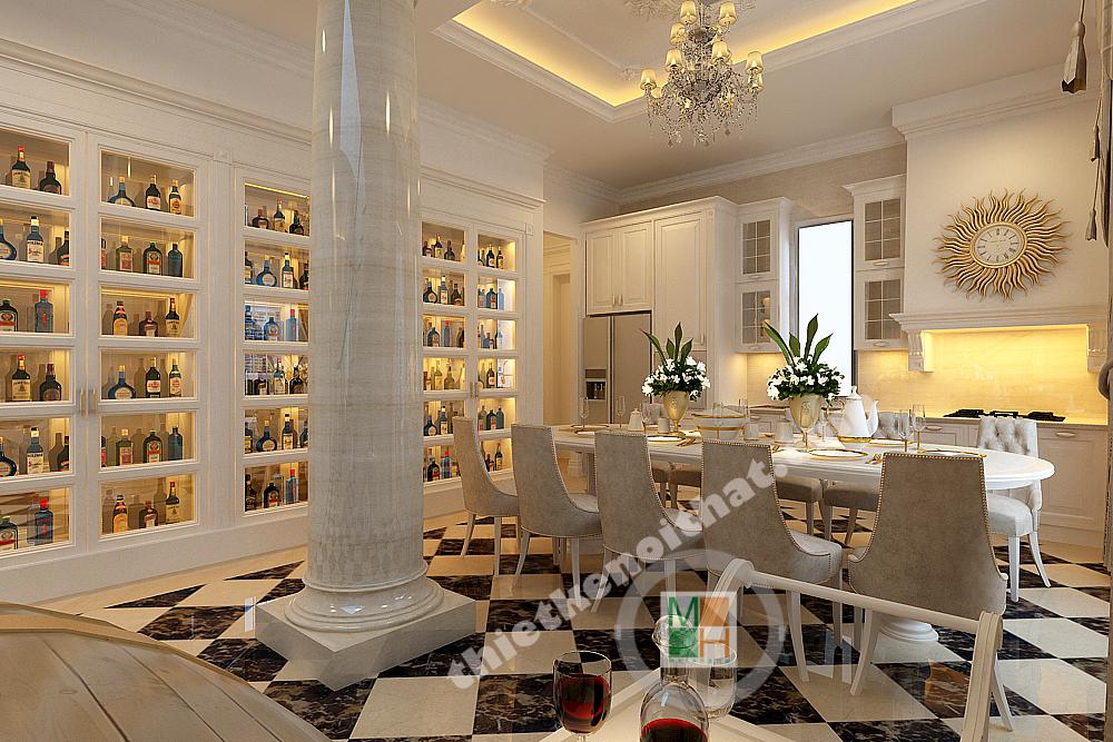Khu vực bếp được trang trí bởi những họa tiết mang phong cách hoàng gia tinh tế và đẹp mắt. Hệ tủ bếp liên hoàn với hệ tủ đa năng âm tường khiến cho căn bếp trông gọn gàng và hiện đại.
