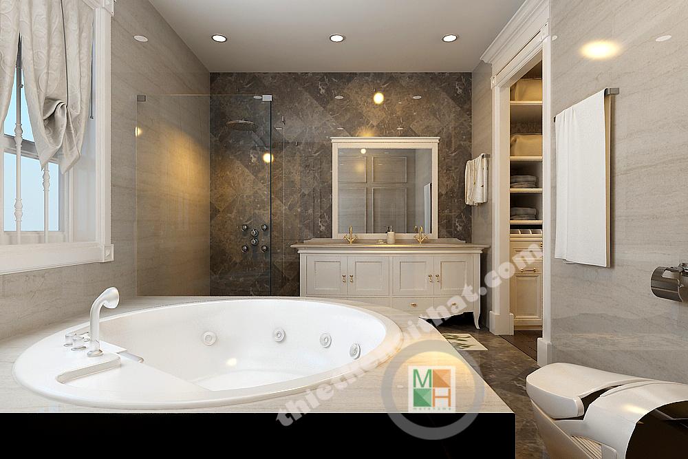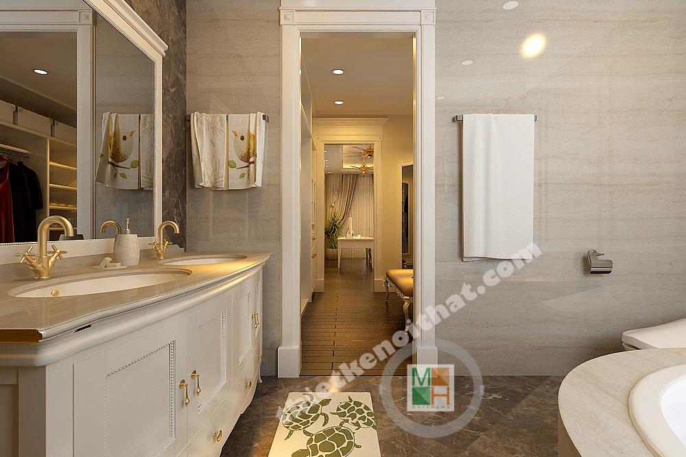 Phòng tắm của biệt thự được thiết kế sang trọng và lịch sự với loại đá ốp có độ bóng cao. Chính những món đồ nội thất sáng màu đã đem lại cảm giác sạch sẽ và hiện đại cho căn phòng. Phòng tắm của master còn có bồn rửa và gương đôi để vợ chồng gia chủ có thể nhanh chóng vệ sinh trước khi đi làm vào buổi sáng.