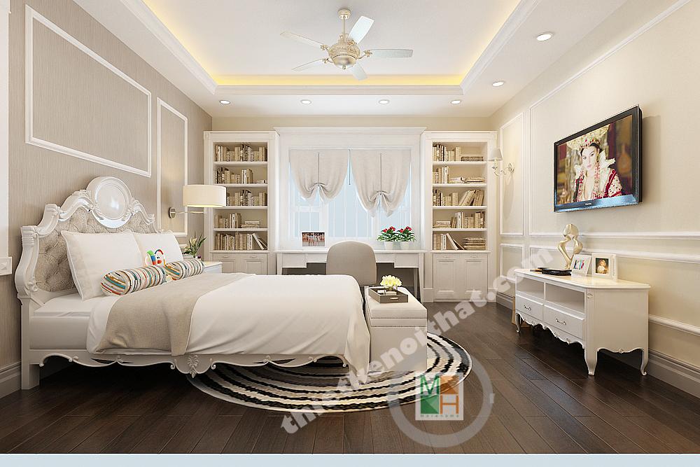 Phòng ngủ của con được thiết kế không có nhiều đồ đạc rườm rà nhưng vẫn đem đến không khí sinh động, giàu sức sống. Tủ sách được thiết kế đối xứng hai bên cửa sổ, phía dưới là bàn học, tạo thành một góc học tập gọn gàng và ấm áp. Tủ quần áo được thiết kế âm tường, để ra một phần không gian trống cho các hoạt động giải trí khác.