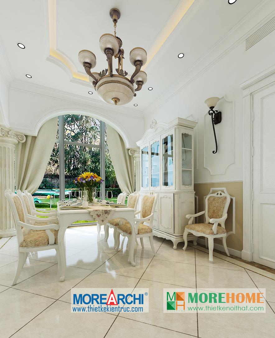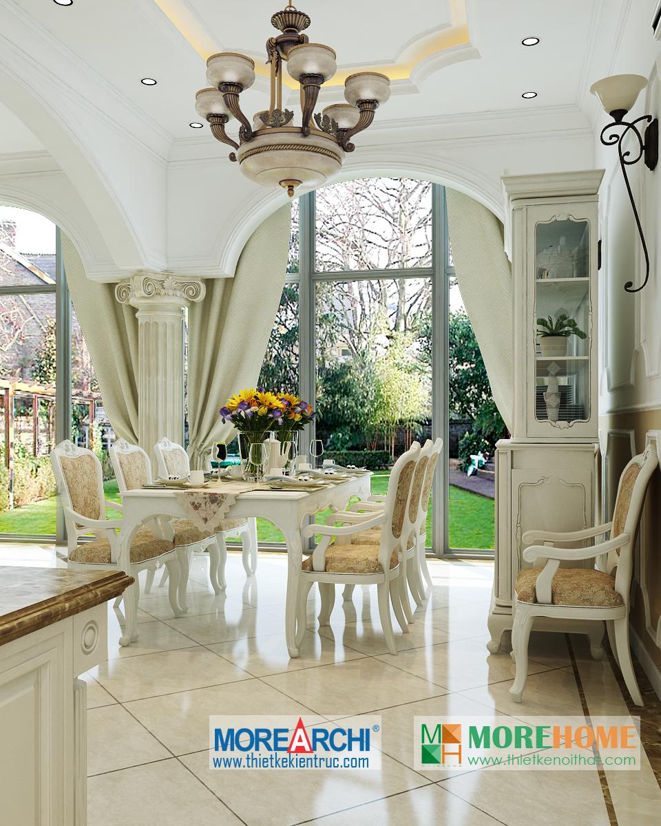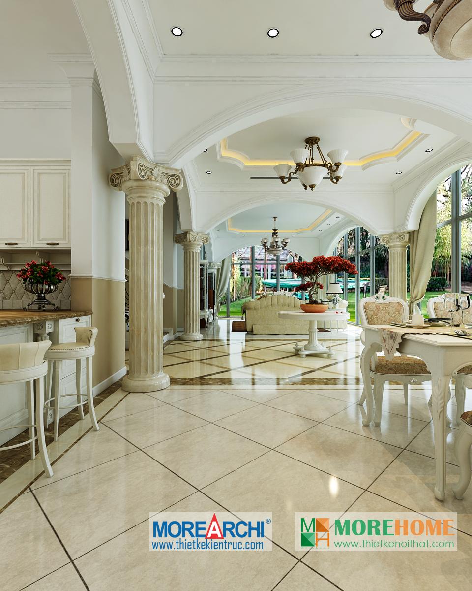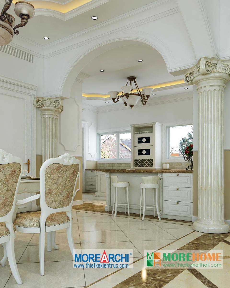 Thiết kế nội thất phòng ăn tân cổ điển hướng sáng nổi bật. Bàn ăn với các thiết kế chi tiết trang trí tinh xảo trên tông màu vàng nâu nhẹ nhàng ăn nhập với không gian tân cổ điển giúp định hình không gian, phong cách và cái Tôi cho căn nhà. Thiết kế tủ rượu đặt một góc phòng vừa đảm bảo tính thẩm mỹ vừa đảm bảo công năng và tiện lợi cho gia chủ. Thiết kế khu bếp liền kề với bàn ăn và phòng khách mang đến cảm giác đồng bộ và tiện lợi cho gia chủ. Một trong những đặc điểm nổi bật và khá khác lạ của căn phòng là thiết kế cột trụ độc đáo. Với trang trí tinh tế, tông màu mang tính cổ điển ấn tượng, các cột trụ đóng vai trò quan trọng trong việc định hình phong cách và gây ấn tượng mạnh cho gia chủ, thể hiện một nét sang trọng và quý phái riêng.