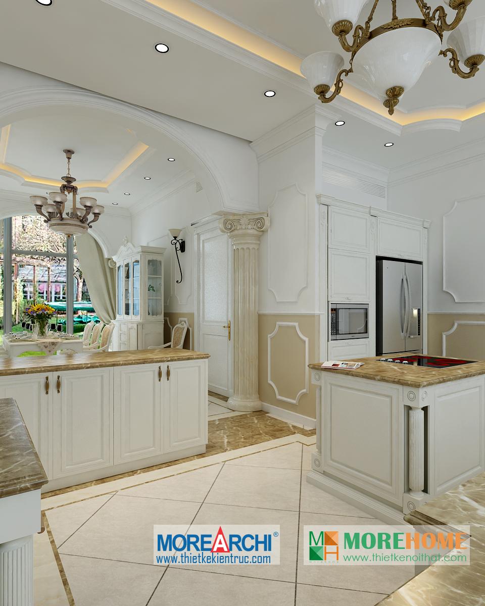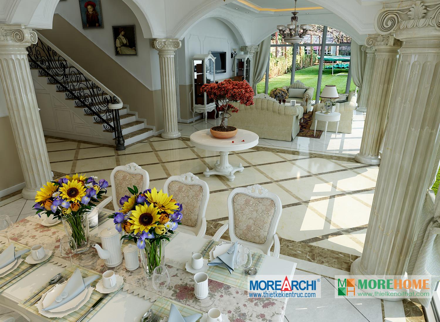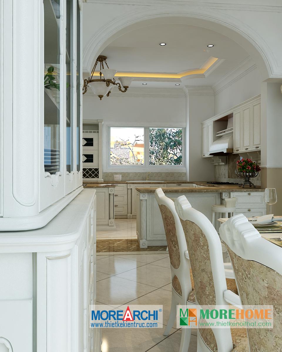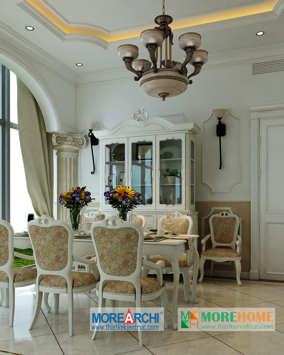 Thiết kế nội thất phòng ăn tân cổ điển hướng sáng nổi bật. Bàn ăn với các thiết kế chi tiết trang trí tinh xảo trên tông màu vàng nâu nhẹ nhàng ăn nhập với không gian tân cổ điển giúp định hình không gian, phong cách và cái Tôi cho căn nhà. Thiết kế tủ rượu đặt một góc phòng vừa đảm bảo tính thẩm mỹ vừa đảm bảo công năng và tiện lợi cho gia chủ. Thiết kế khu bếp liền kề với bàn ăn và phòng khách mang đến cảm giác đồng bộ và tiện lợi cho gia chủ. Một trong những đặc điểm nổi bật và khá khác lạ của căn phòng là thiết kế cột trụ độc đáo. Với trang trí tinh tế, tông màu mang tính cổ điển ấn tượng, các cột trụ đóng vai trò quan trọng trong việc định hình phong cách và gây ấn tượng mạnh cho gia chủ, thể hiện một nét sang trọng và quý phái riêng.