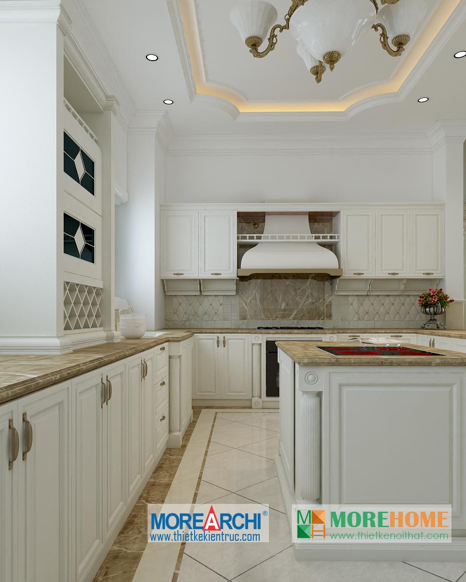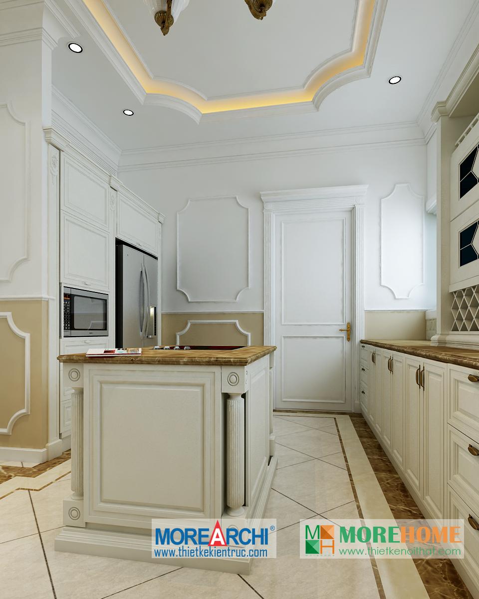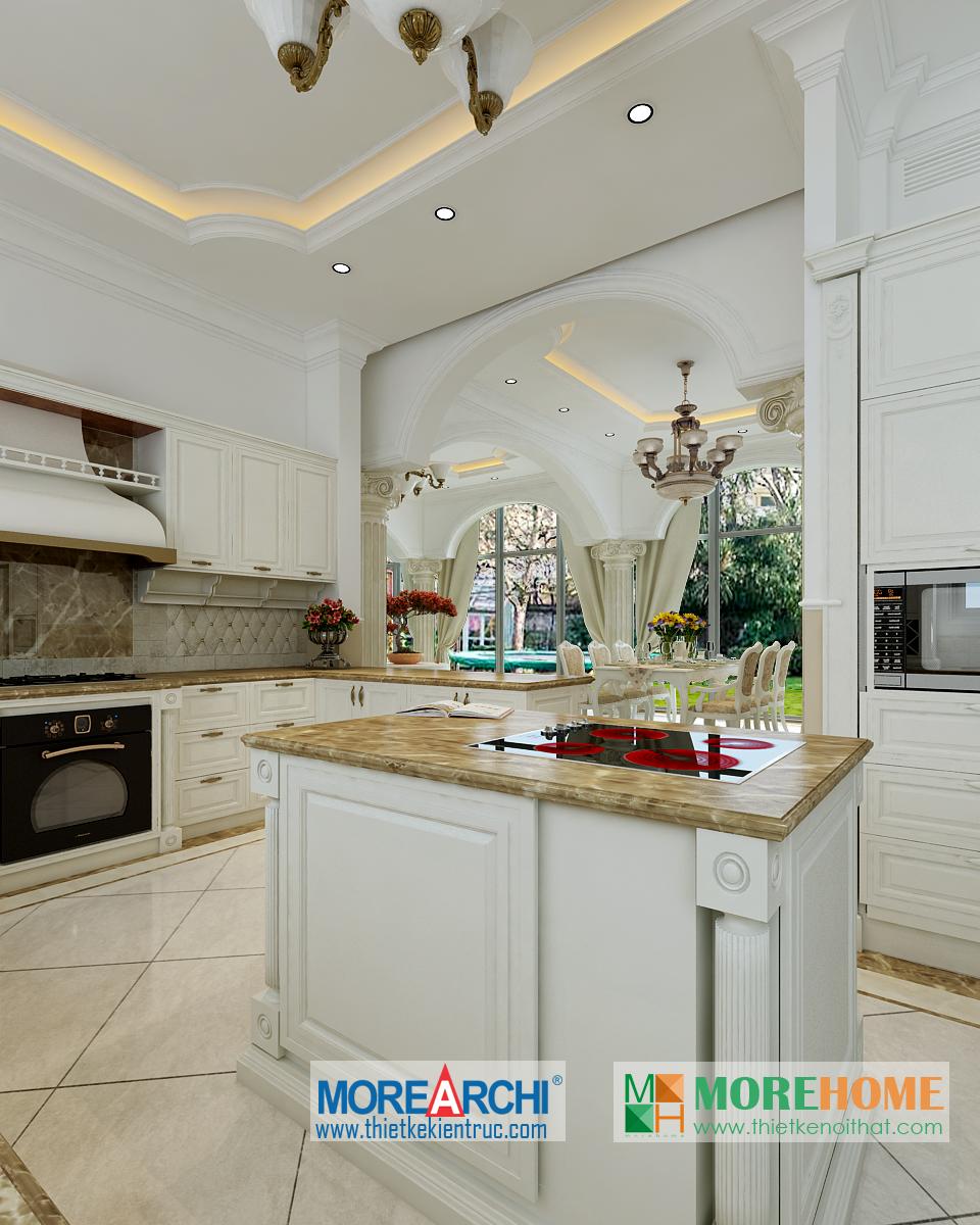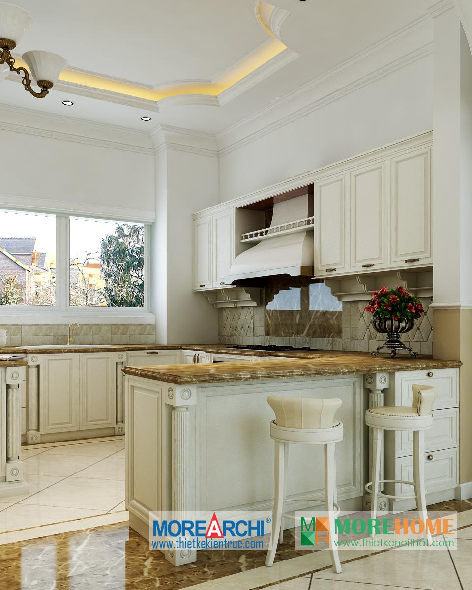 Thiết kế nội thất phòng ăn tân cổ điển hướng sáng nổi bật. Bàn ăn với các thiết kế chi tiết trang trí tinh xảo trên tông màu vàng nâu nhẹ nhàng ăn nhập với không gian tân cổ điển giúp định hình không gian, phong cách và cái Tôi cho căn nhà. Thiết kế tủ rượu đặt một góc phòng vừa đảm bảo tính thẩm mỹ vừa đảm bảo công năng và tiện lợi cho gia chủ. Thiết kế khu bếp liền kề với bàn ăn và phòng khách mang đến cảm giác đồng bộ và tiện lợi cho gia chủ. Một trong những đặc điểm nổi bật và khá khác lạ của căn phòng là thiết kế cột trụ độc đáo. Với trang trí tinh tế, tông màu mang tính cổ điển ấn tượng, các cột trụ đóng vai trò quan trọng trong việc định hình phong cách và gây ấn tượng mạnh cho gia chủ, thể hiện một nét sang trọng và quý phái riêng.