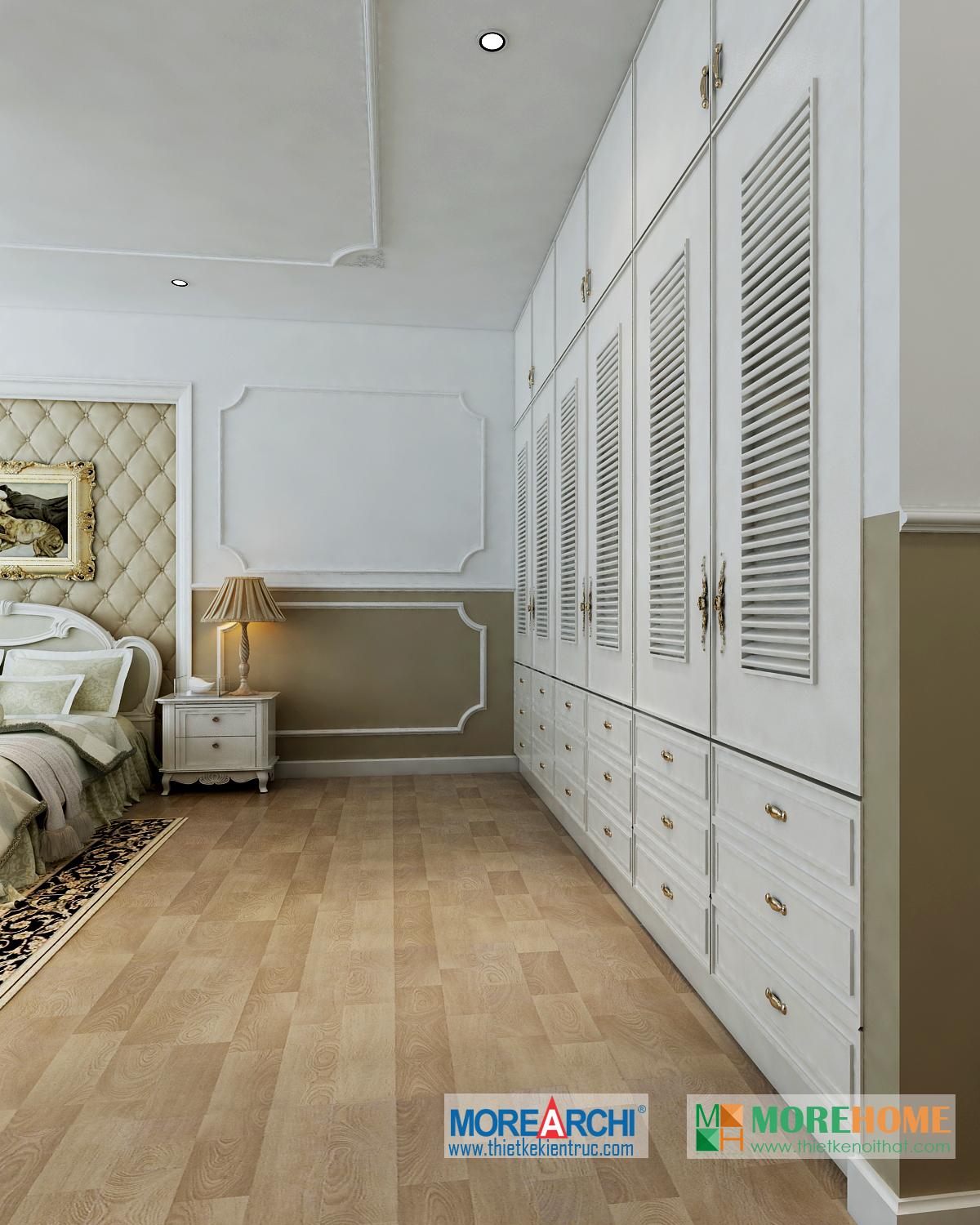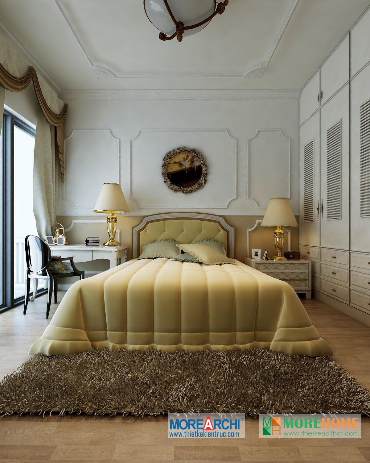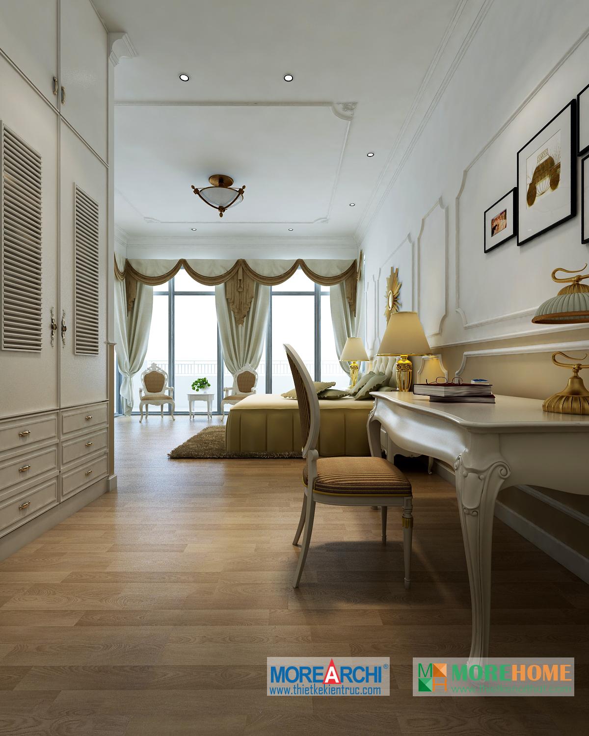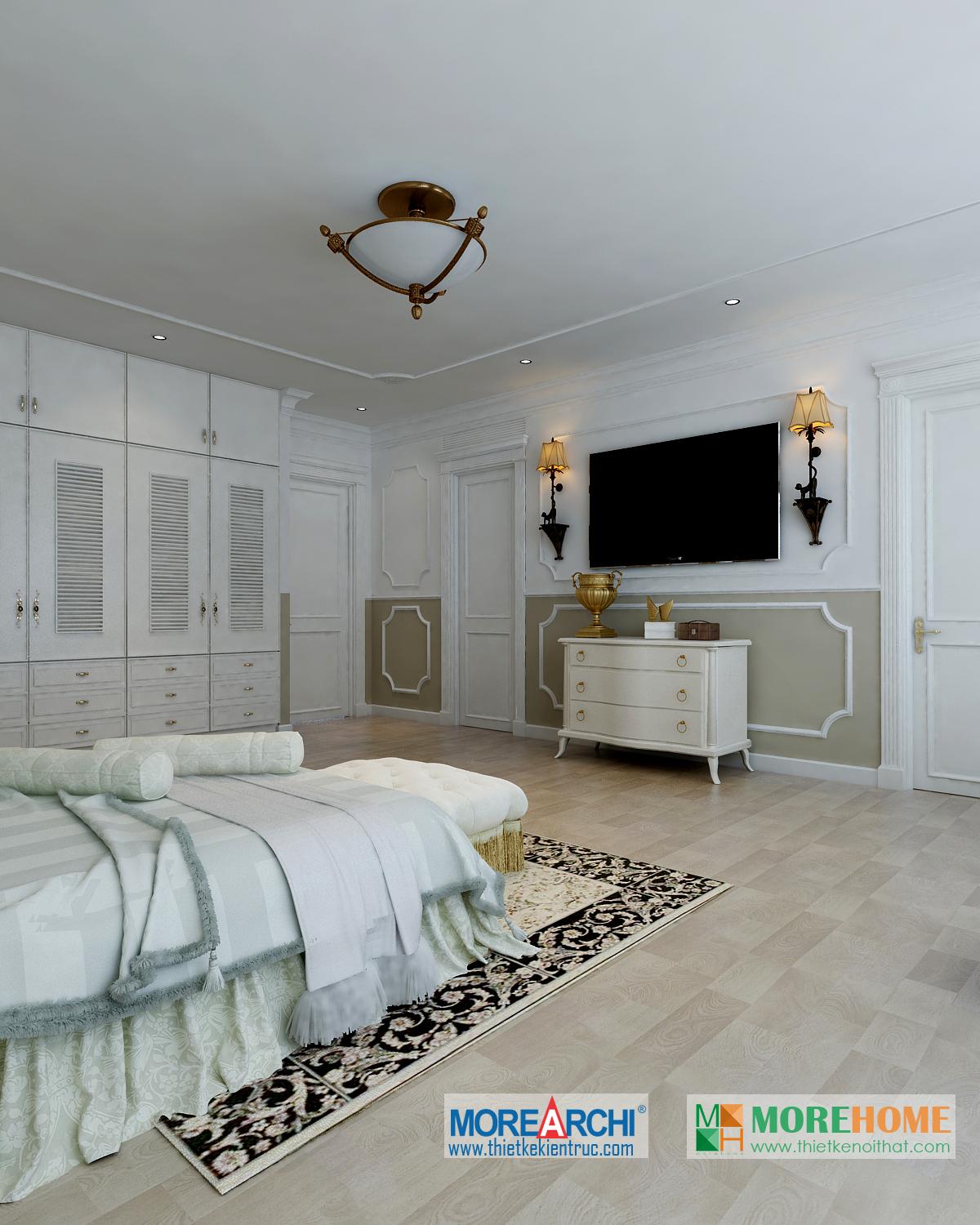 Thiết kế phòng ngủ mang đến cho gia chủ cảm giác sang trọng và ấm cúng. Tông màu trắng sáng kết hợp hài hòa với thiết kế tân cổ điển và đường cong nhẹ nhàng nổi bật. Hệ thống tủ gỗ thiết kế gần như đồng nhất tạo không gian lớn và mở, tạo diện tích cho không gian đa năng, phù hợp với các gia đình với trẻ nhỏ.