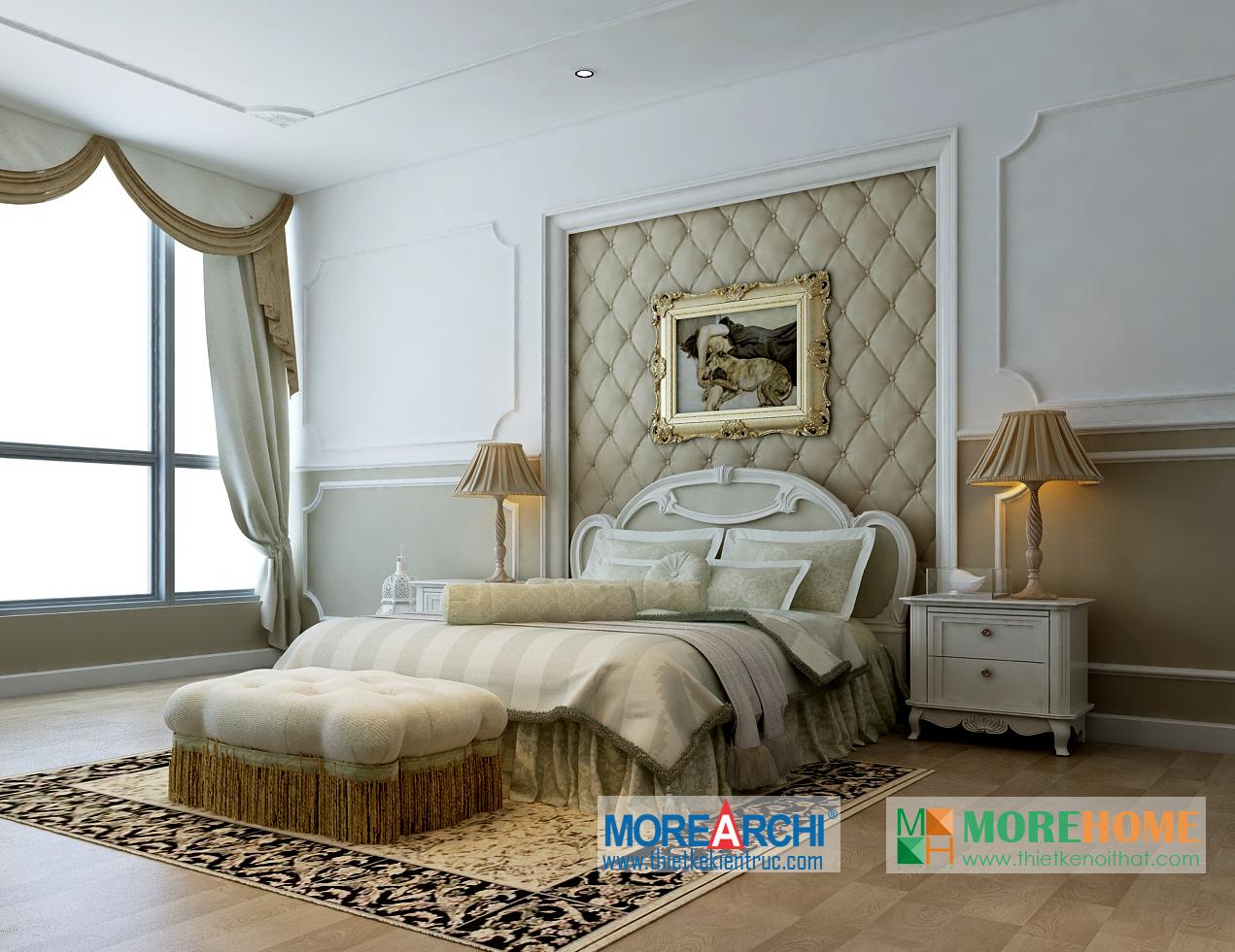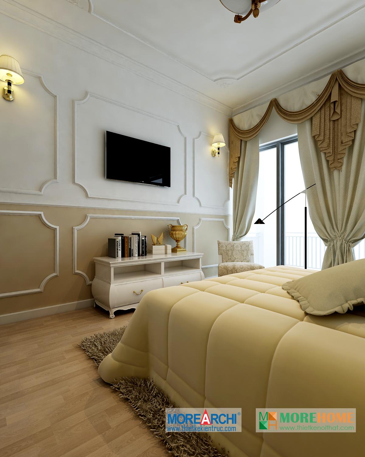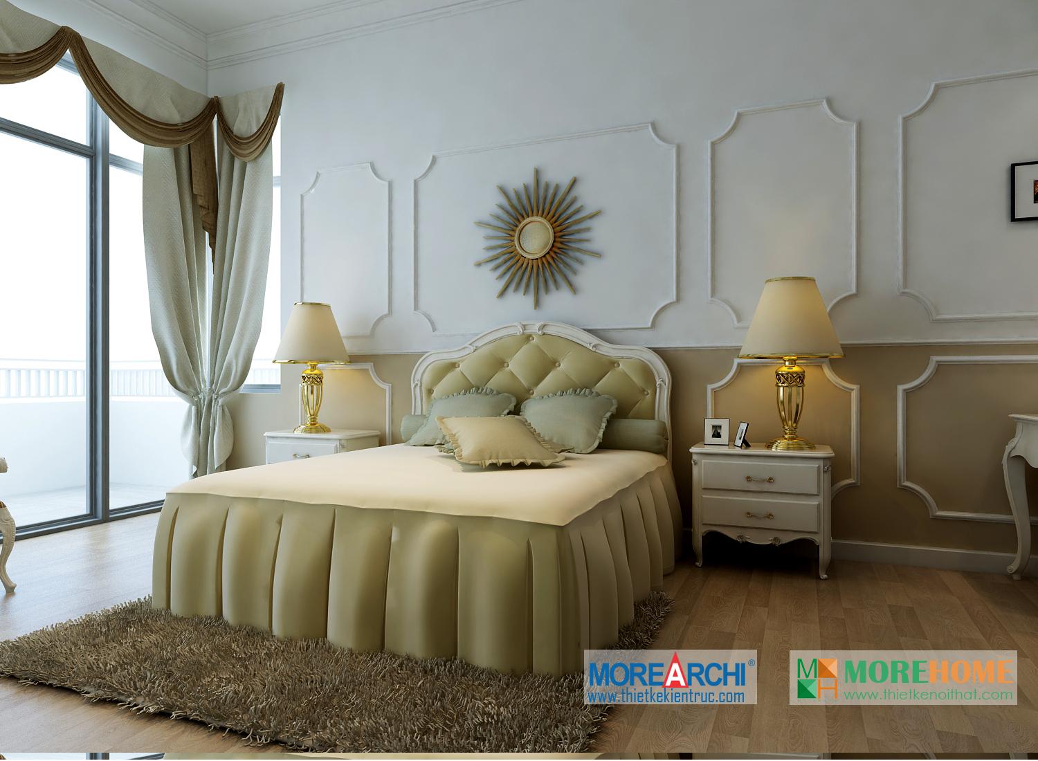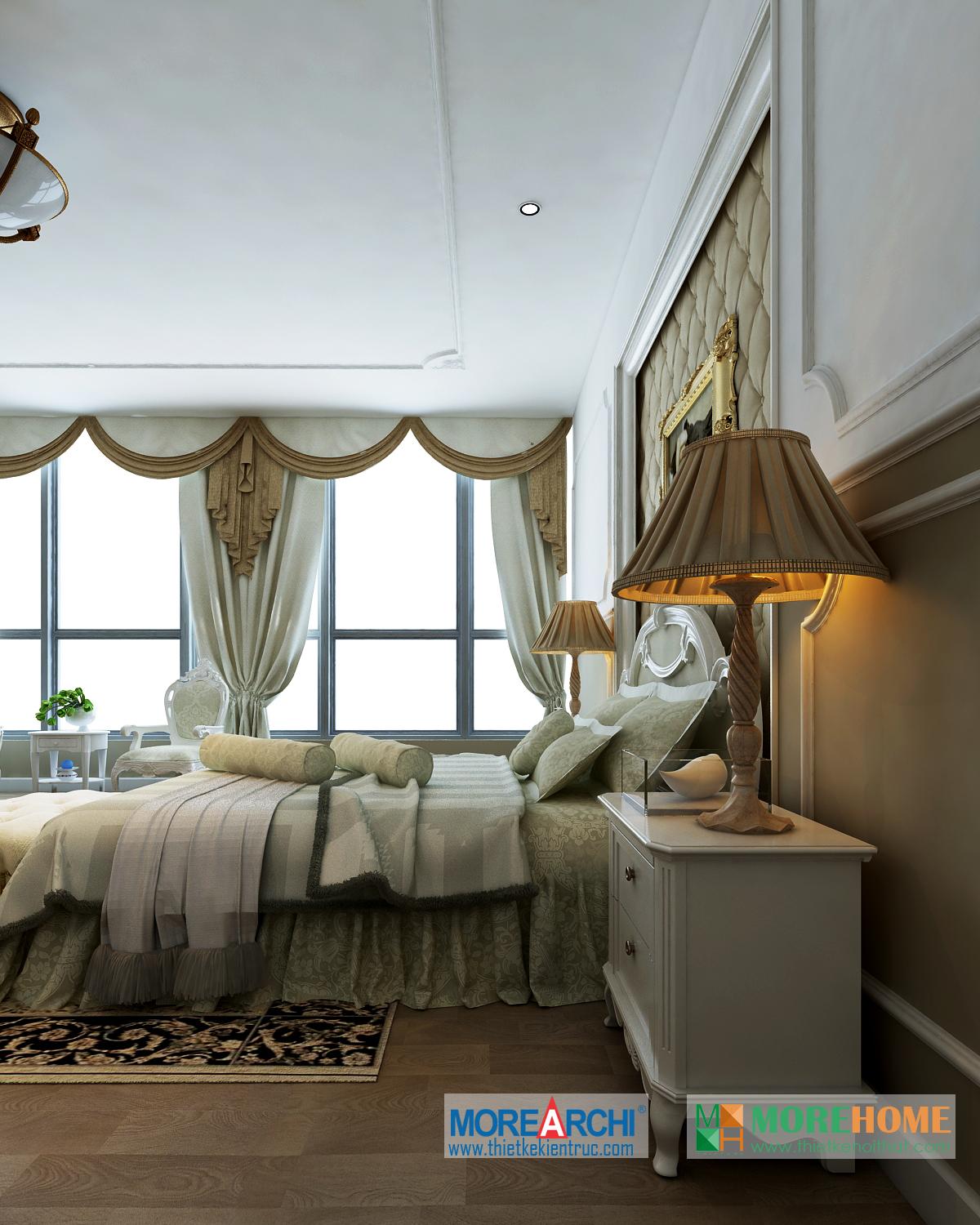 Thiết kế phòng ngủ mang đến cho gia chủ cảm giác sang trọng và ấm cúng. Tông màu trắng sáng kết hợp hài hòa với thiết kế tân cổ điển và đường cong nhẹ nhàng nổi bật. Hệ thống tủ gỗ thiết kế gần như đồng nhất tạo không gian lớn và mở, tạo diện tích cho không gian đa năng, phù hợp với các gia đình với trẻ nhỏ.