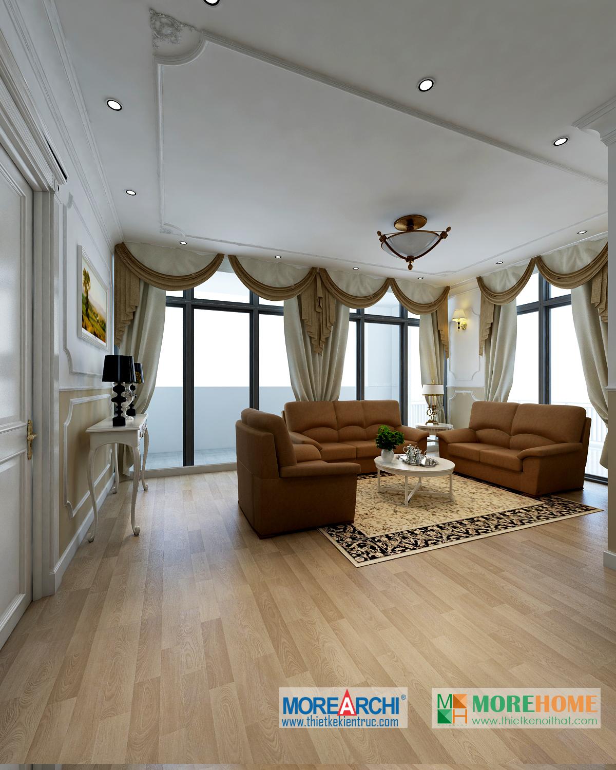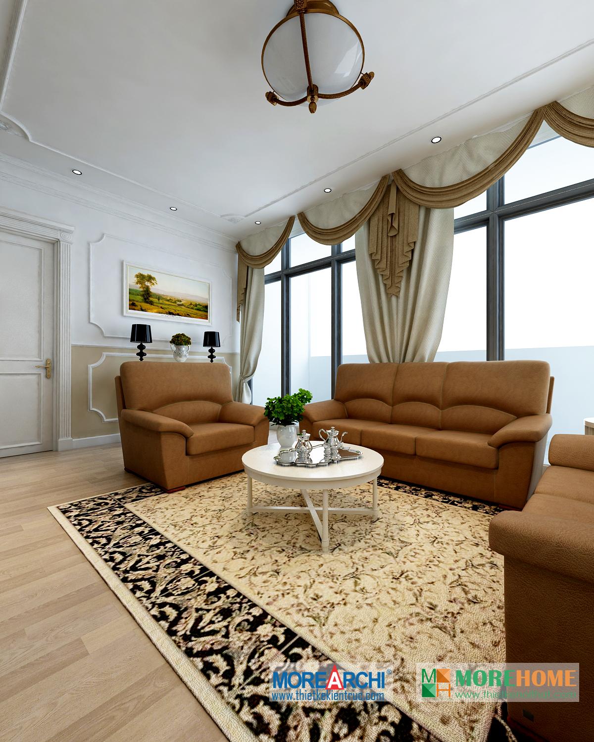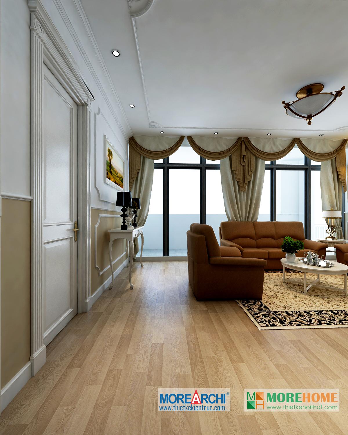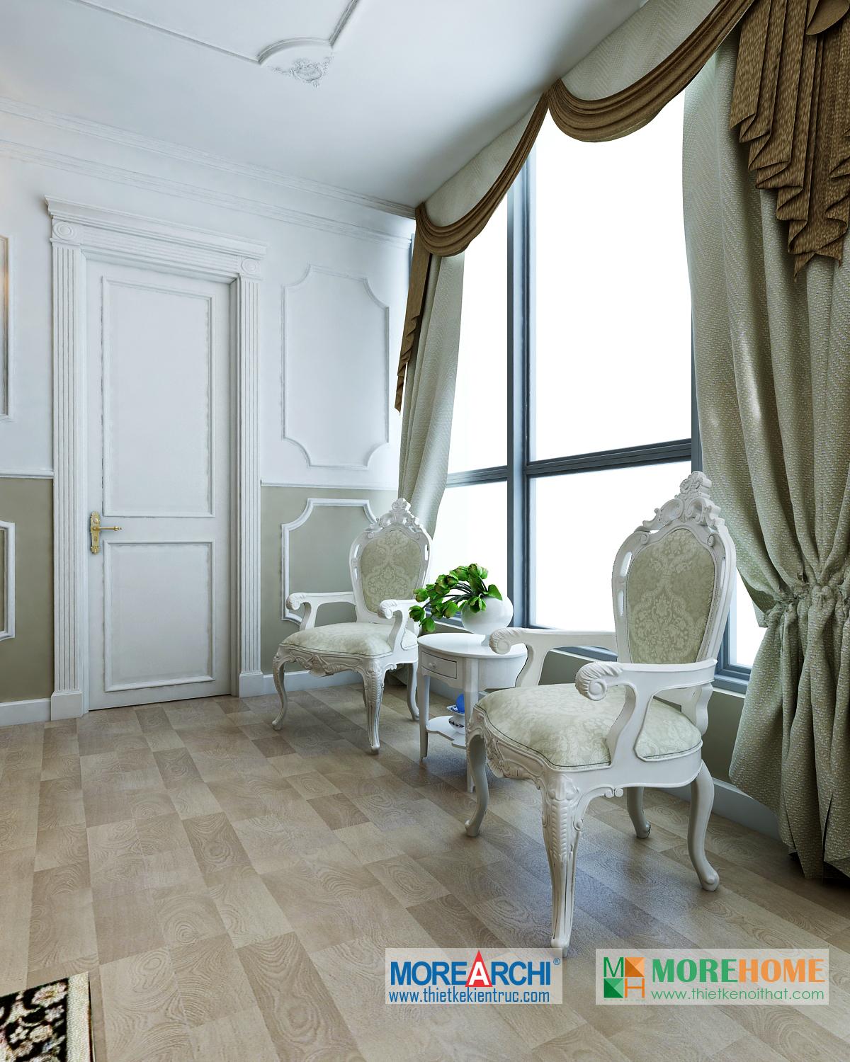 Một trong những điểm nhấn đáng chú ý của căn phòng là không gian hướng sáng khá nhiều. Thiết kế nội thất tân cổ điển chú trọng ánh sáng tự nhiên, tận dụng tối đa không gian hướng sáng mang đến sức sống cho không gian phòng và các khu sinh hoạt chung.