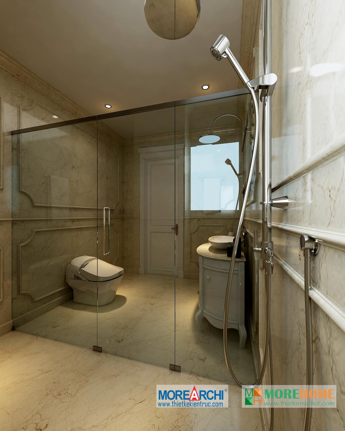 Thiết kế phòng tắm sử dụng các vật liệu nhẹ như kính giúp tăng diện tích sử dụng và tạo độ thoáng cho căn phòng. Không gian phòng được mở rộng và khá nổi bật, kết hợp hài hòa với ánh sáng và màu sắc mang đến cảm giác thoải mái và dễ chịu cho gia chủ.