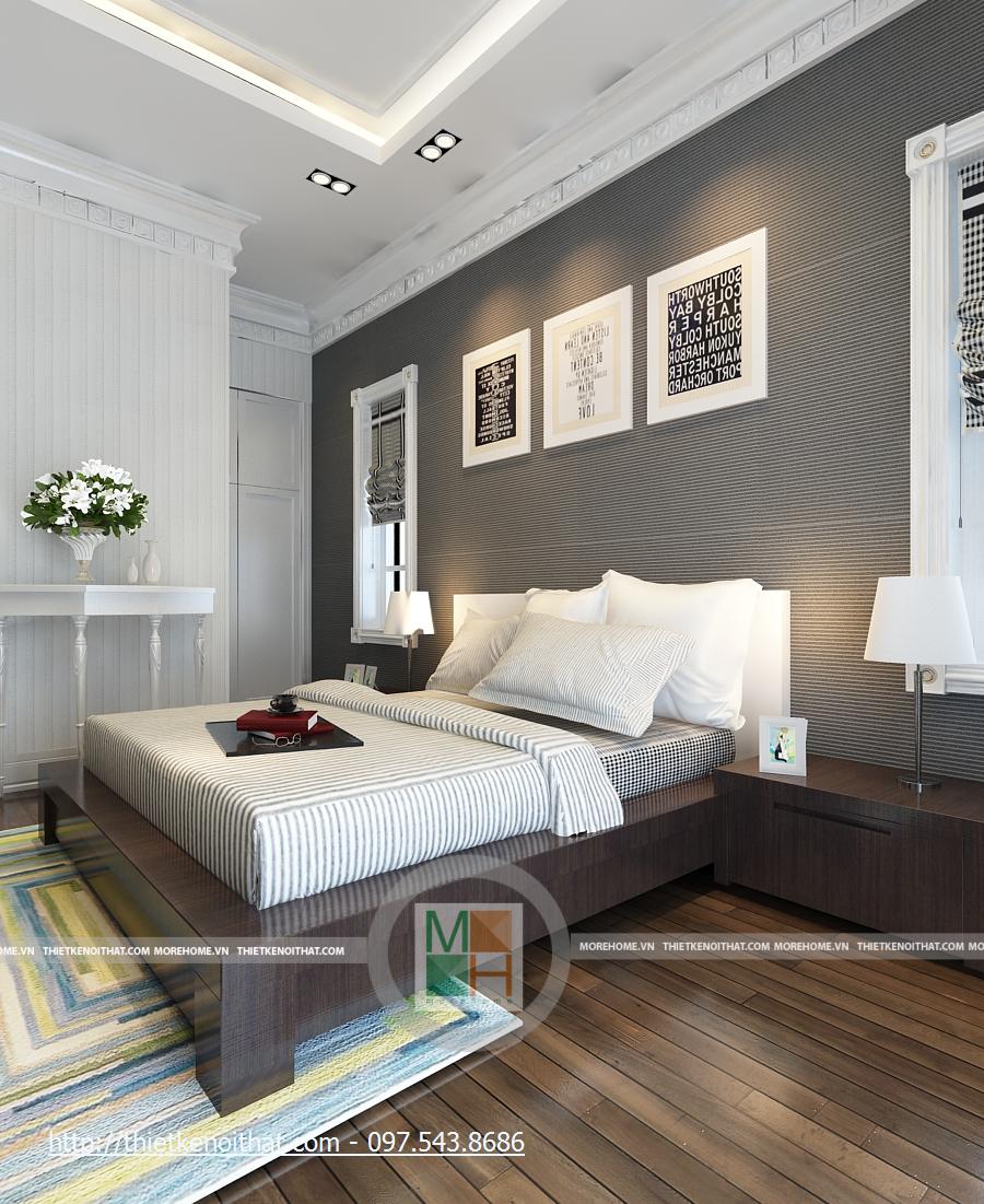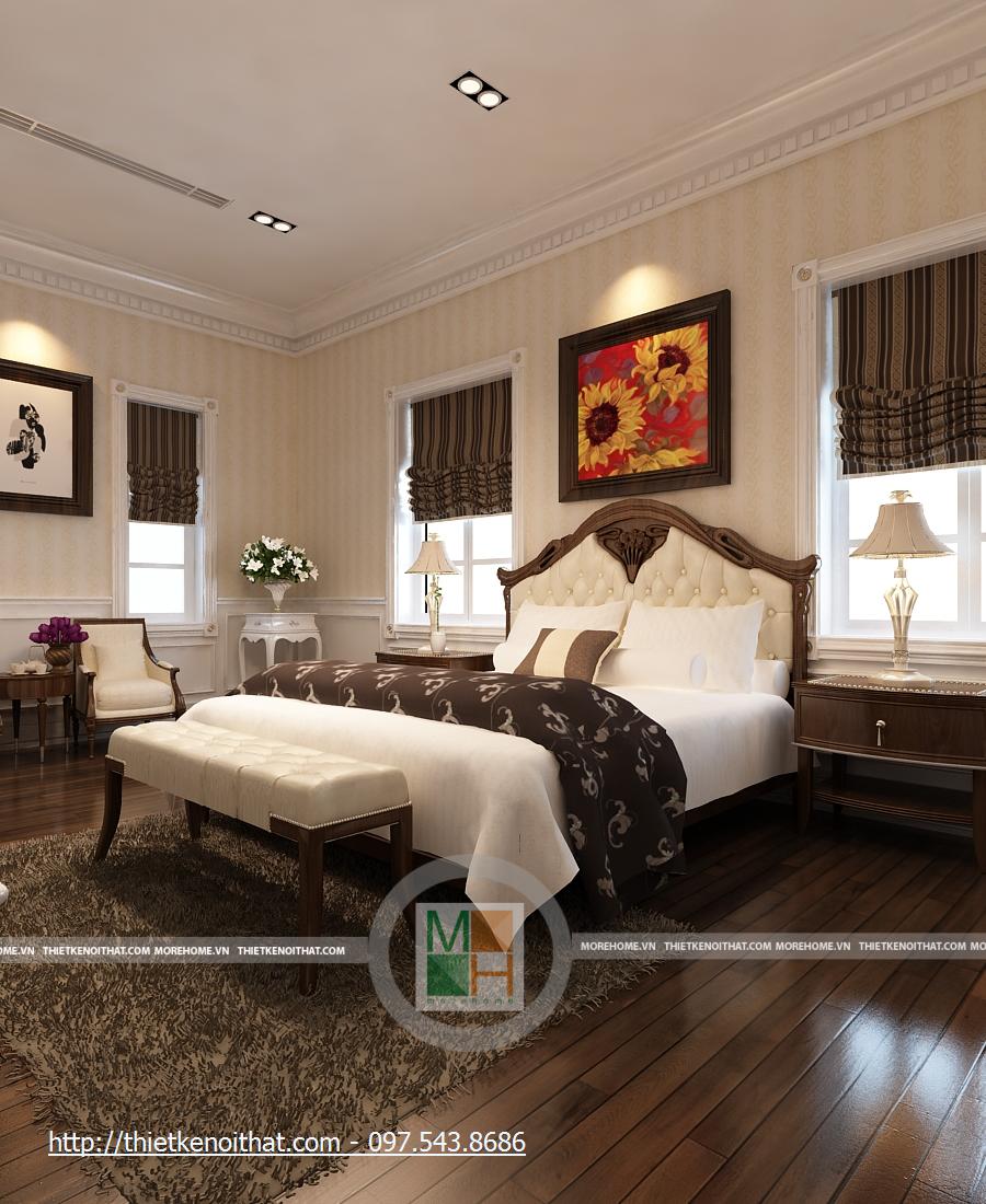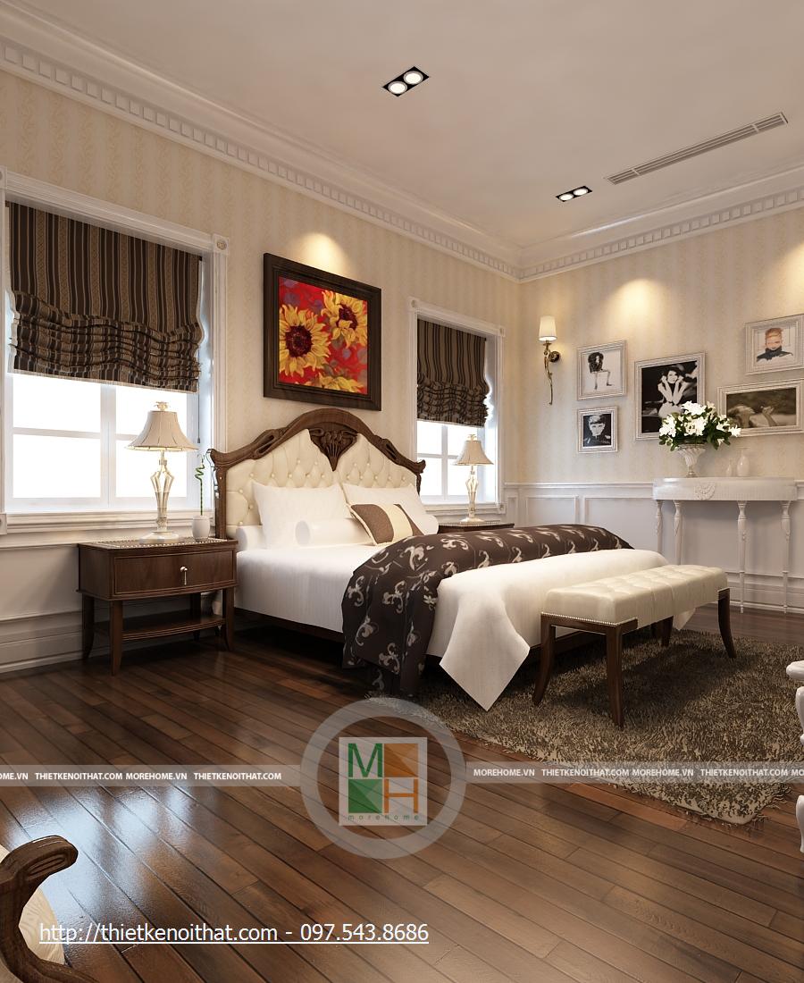 Phòng ngủ bố mẹ rất rộng với những thiết kế nội thất sang trọng. Giường lớn được đặt ở giữa phòng với màu ga màu sáng, nổi bật trên đó là chăn gối màu nâu. Cạnh giường là 2 cửa sổ lớn, tạo một không gian ánh sáng rất đẹp. Hai chiếc kệ nhỏ được kê sát cửa sổ để đặt đèn ngủ. Tường được trang trí màu vàng nhẹ, kết hợp với đèn tường và đèn hắt trần cùng màu, tạo sự ấm cúng cho căn phòng. Phòng có 2 cửa sổ phụ, giúp có thêm ánh sáng tự nhiên, cạnh đó là bộ bàn ghế uống nước nhỏ. Tủ đồ lớn được đặt sát tường cạnh cửa ra vào, chiếm gần hết diện tích căn phòng. Đối diện giường là kệ đặt TV và cũng là một cái tủ nhỏ đựng các vật dụng đơn giản. Đối xứng hai bên là 2 chiếc kệ cao để đặt bình hoa, giúp căn phòng thêm tươi mới