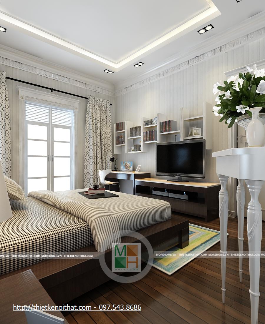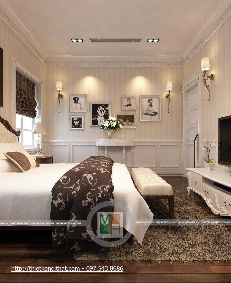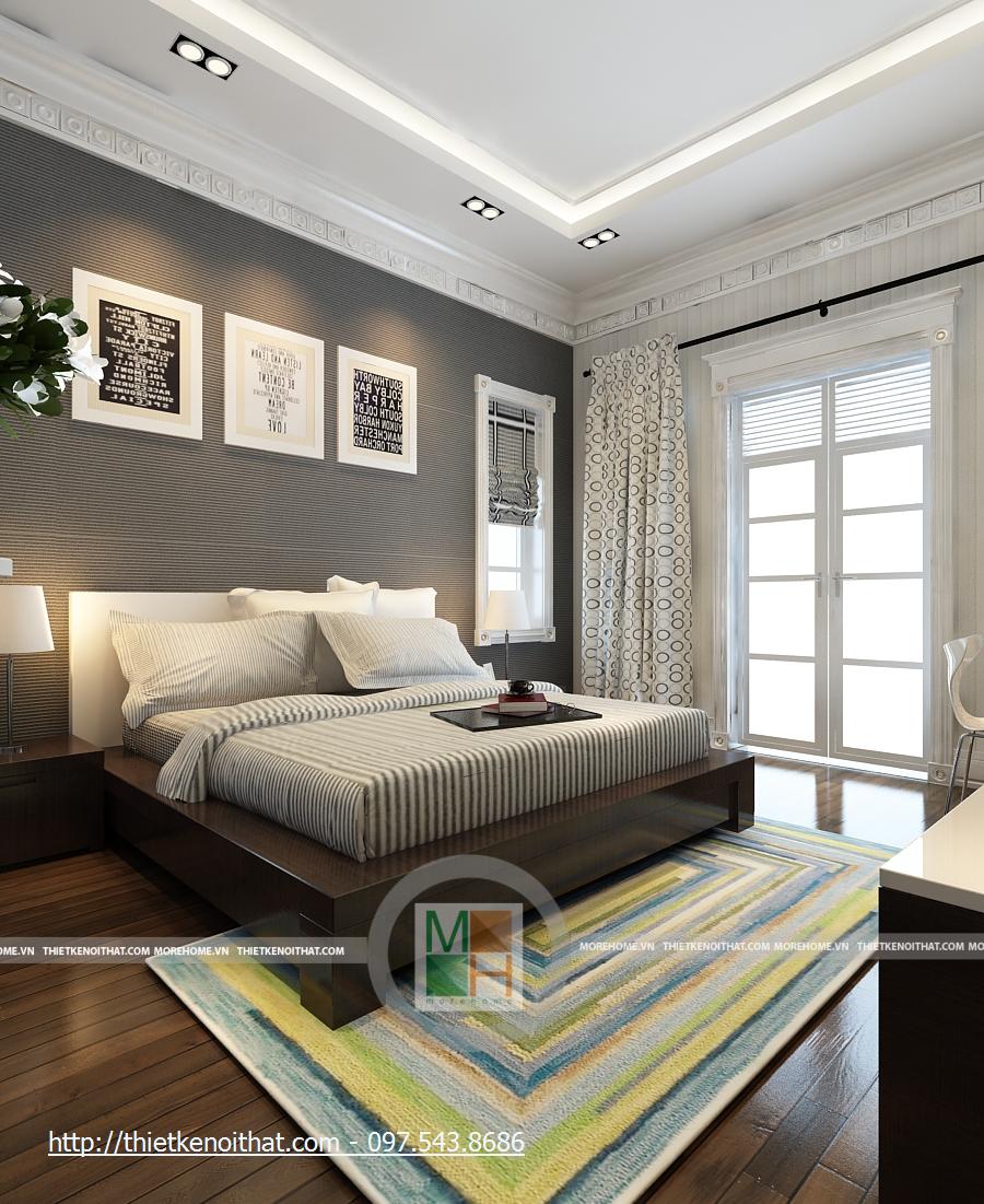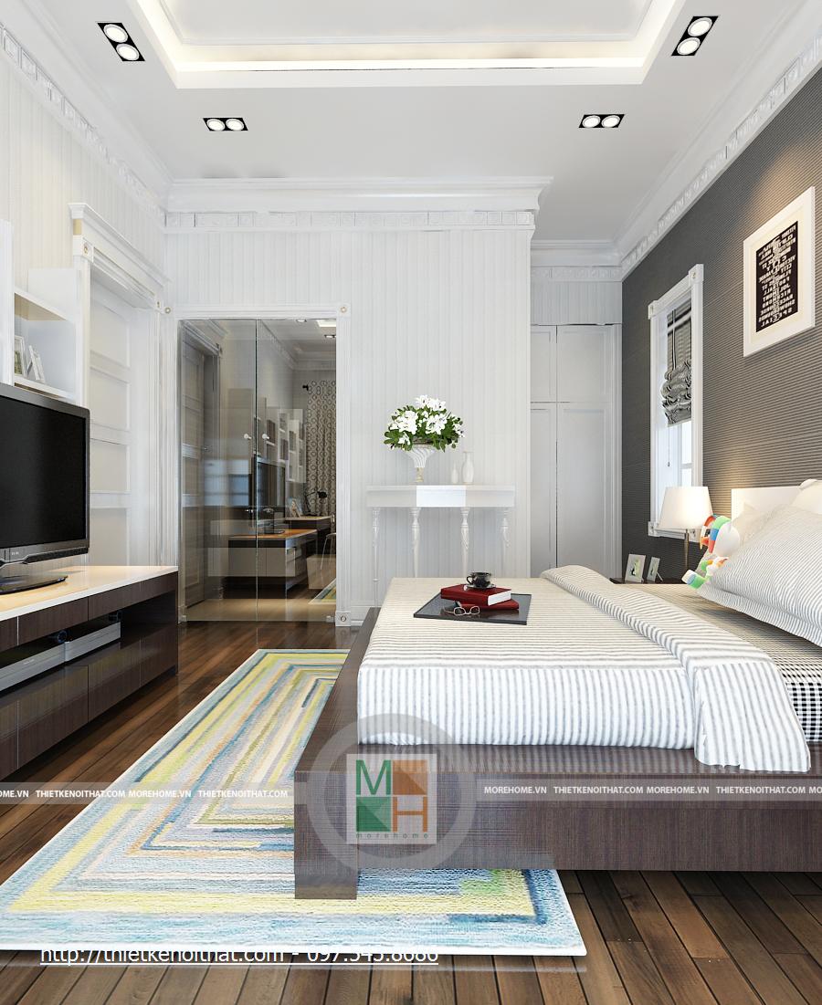 Phòng ngủ bố mẹ rất rộng với những thiết kế nội thất sang trọng. Giường lớn được đặt ở giữa phòng với màu ga màu sáng, nổi bật trên đó là chăn gối màu nâu. Cạnh giường là 2 cửa sổ lớn, tạo một không gian ánh sáng rất đẹp. Hai chiếc kệ nhỏ được kê sát cửa sổ để đặt đèn ngủ. Tường được trang trí màu vàng nhẹ, kết hợp với đèn tường và đèn hắt trần cùng màu, tạo sự ấm cúng cho căn phòng. Phòng có 2 cửa sổ phụ, giúp có thêm ánh sáng tự nhiên, cạnh đó là bộ bàn ghế uống nước nhỏ. Tủ đồ lớn được đặt sát tường cạnh cửa ra vào, chiếm gần hết diện tích căn phòng. Đối diện giường là kệ đặt TV và cũng là một cái tủ nhỏ đựng các vật dụng đơn giản. Đối xứng hai bên là 2 chiếc kệ cao để đặt bình hoa, giúp căn phòng thêm tươi mới