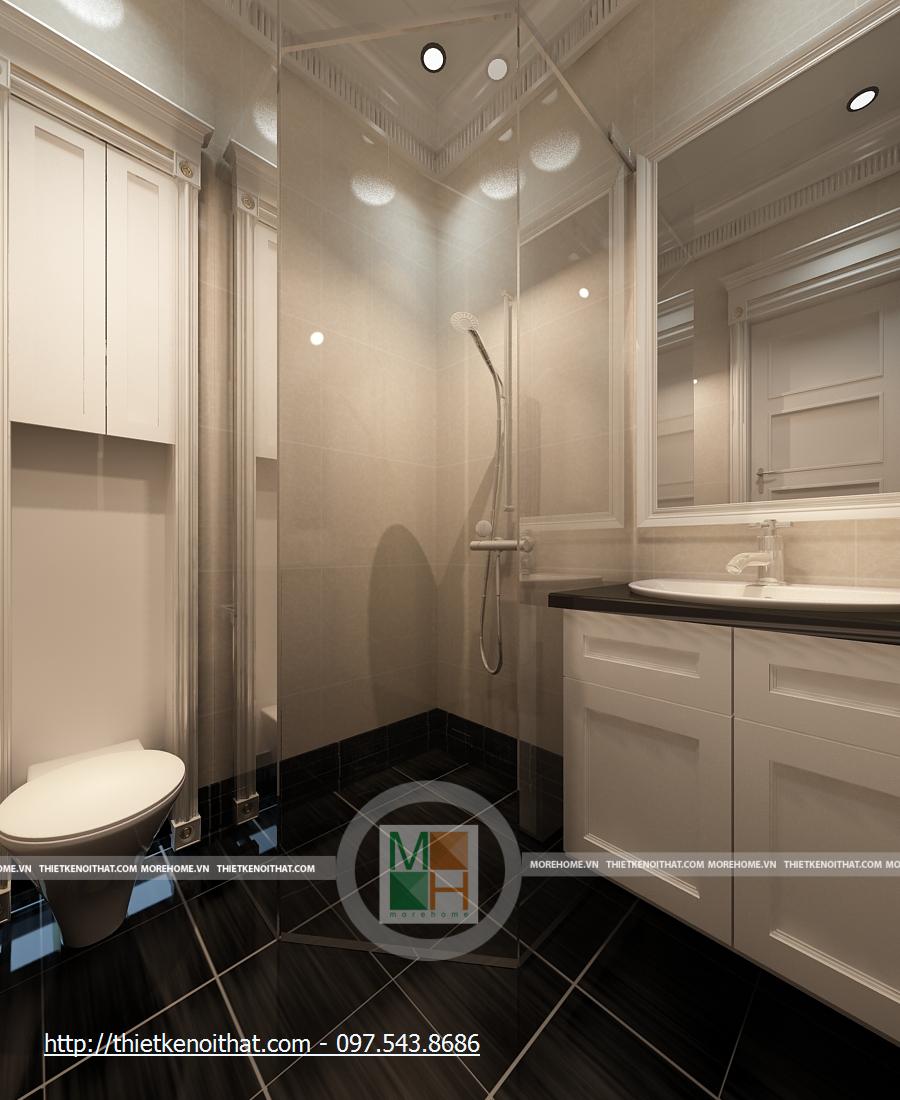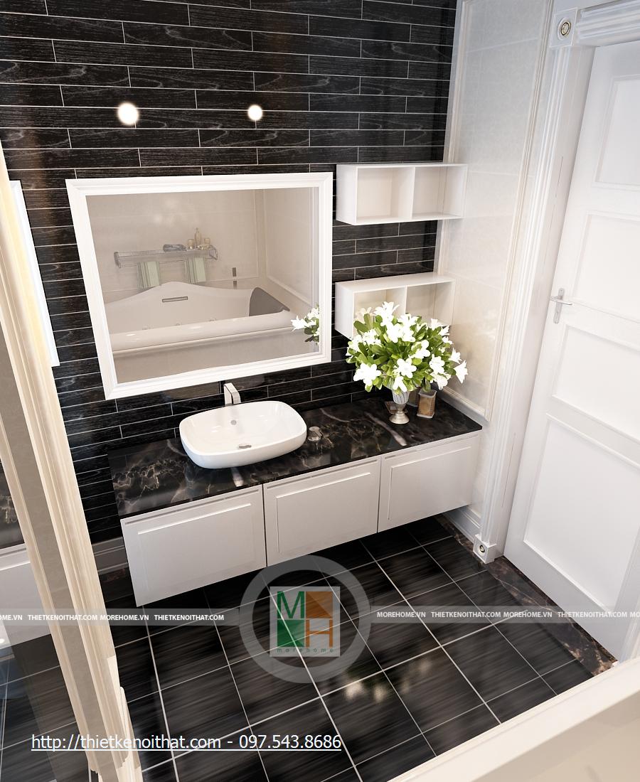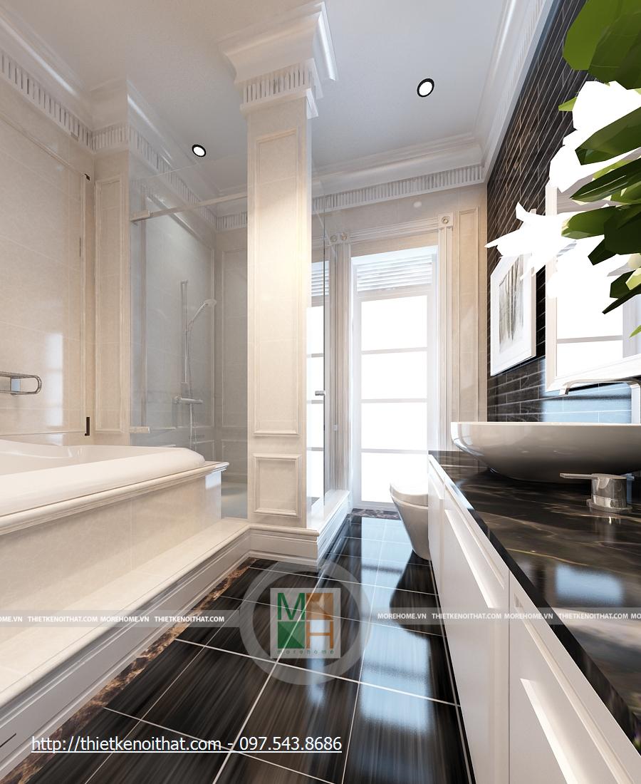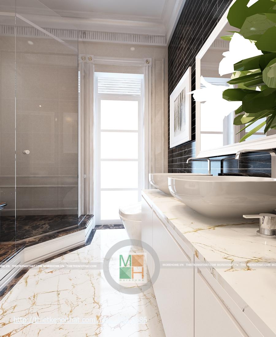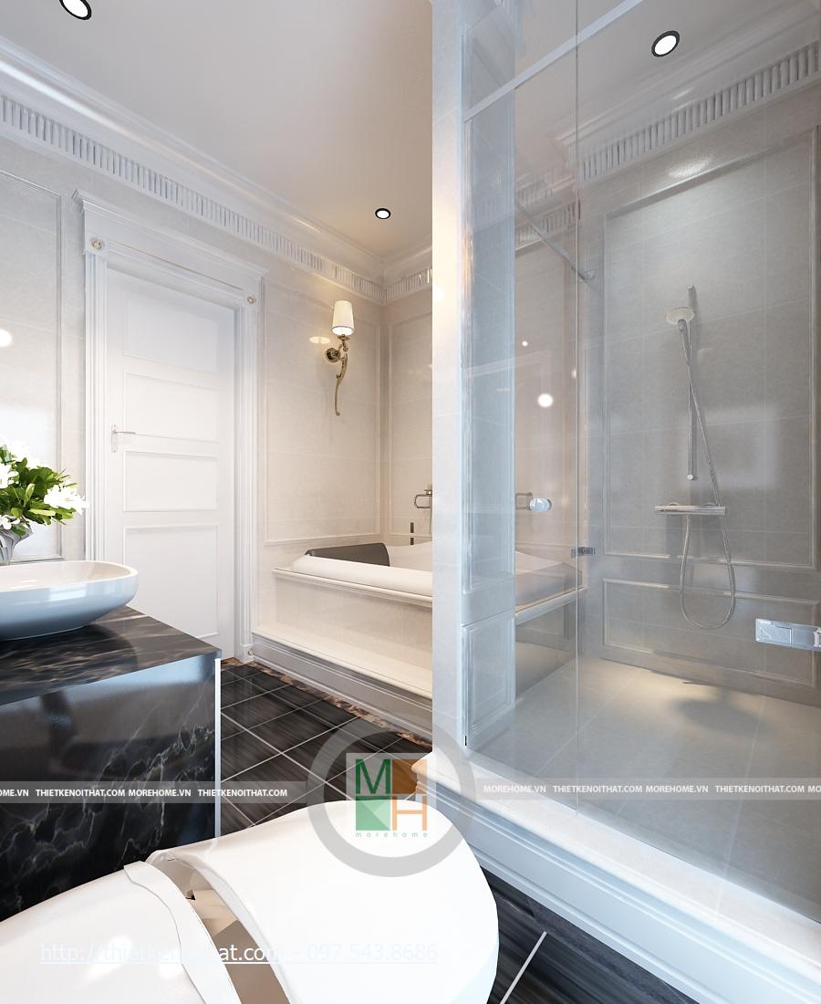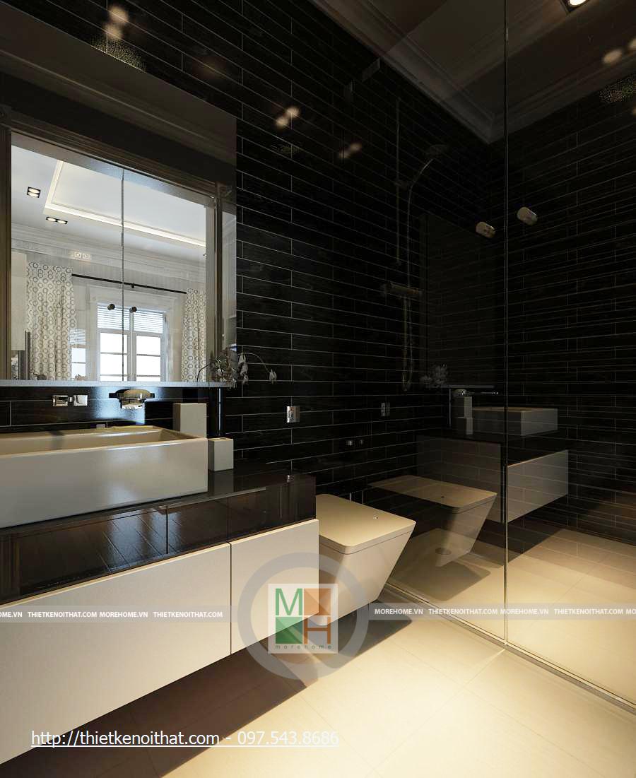 Khu vệ sinh của phòng bố mẹ vô cùng sang trọng và tiện nghi. Sự tương phản nổi bật ở đây là màu gạch và màu tường. Phòng được trang bị bồn tắm hiện đại, bồn rửa mặt cạnh gương lớn, tạo độ mở cho căn phòng. Viền trang trí của chiếc gương cũng giúp căn phòng thêm sang trọng. Ở đây, khu vực tắm bằng vòi sen không được ngăn ra, giúp cho không gian không bị hạn chế. Cửa sổ lớn, giúp cho căn phòng luôn đầy đủ ánh sáng tự nhiên.