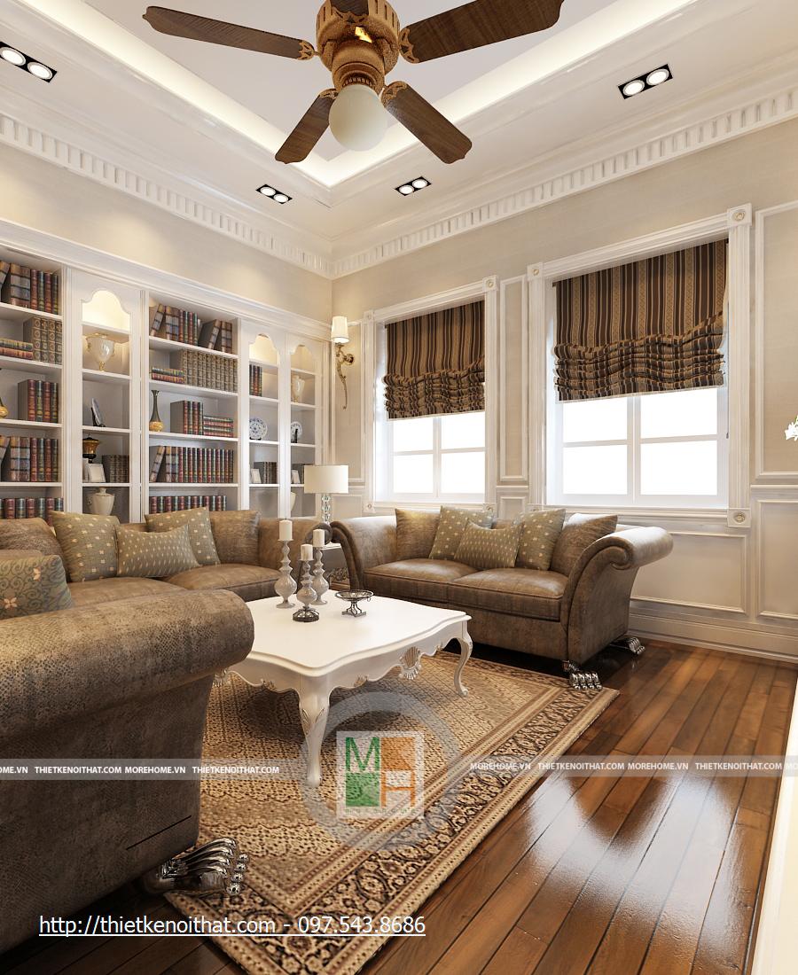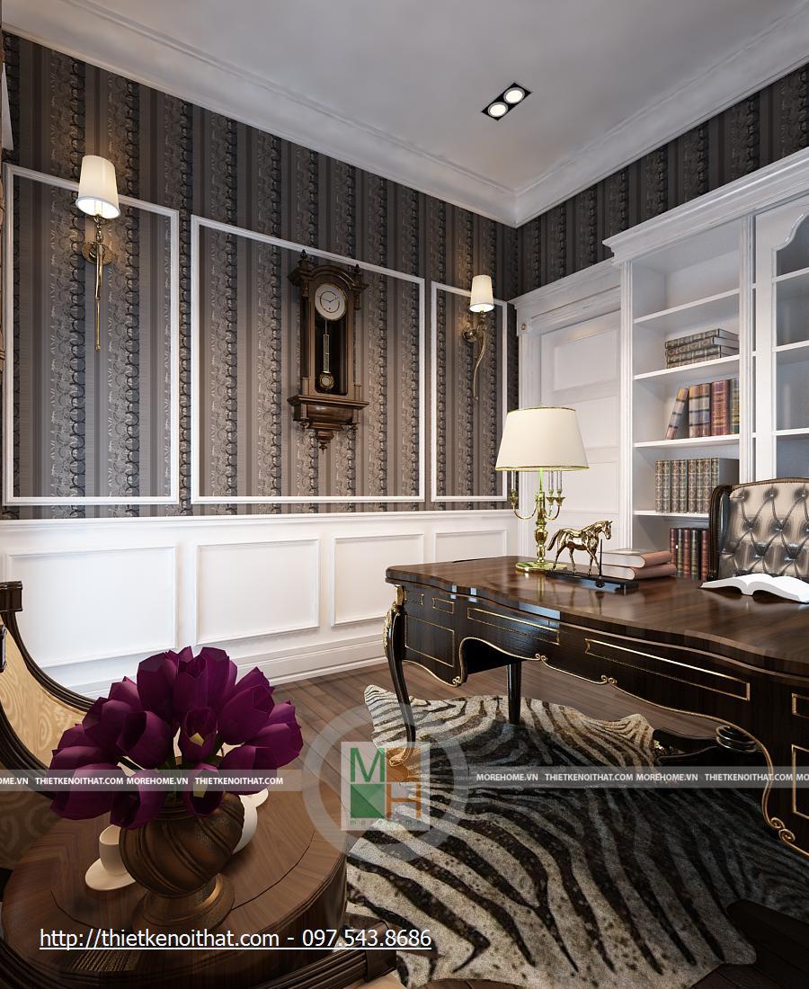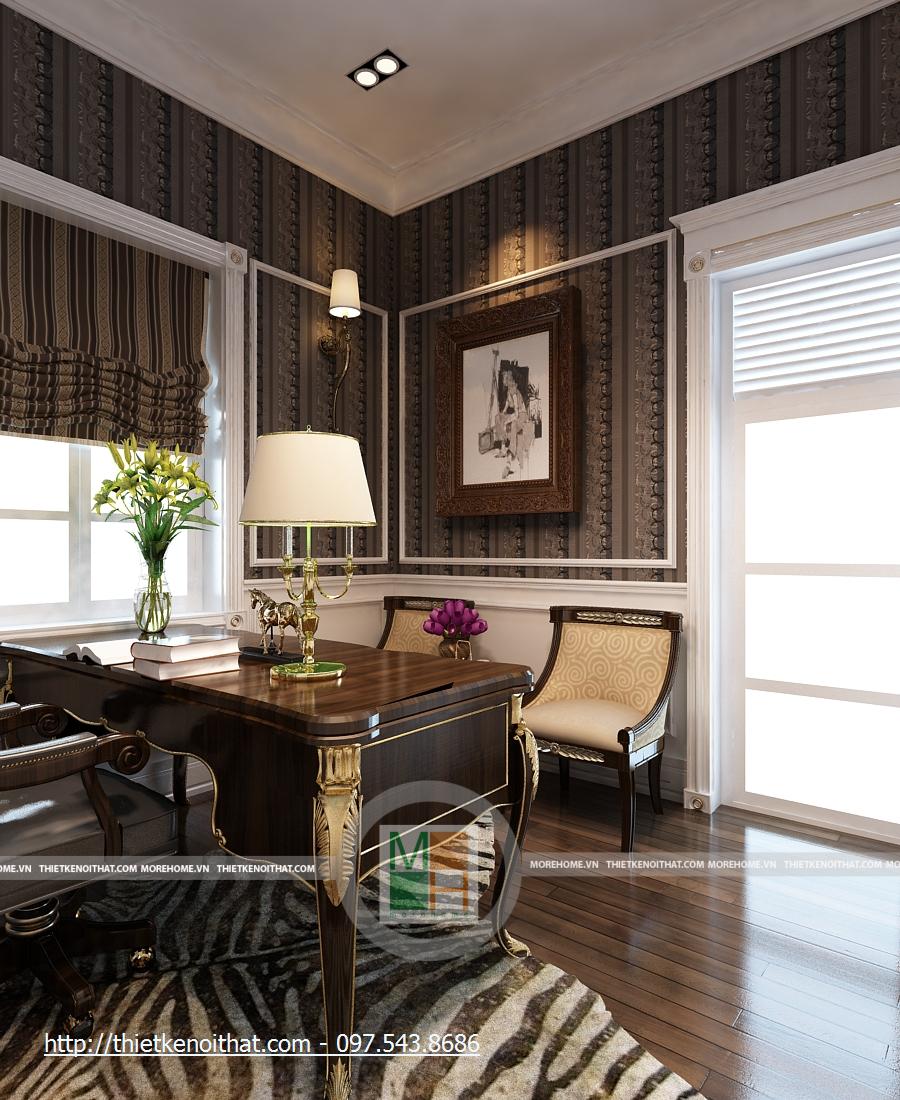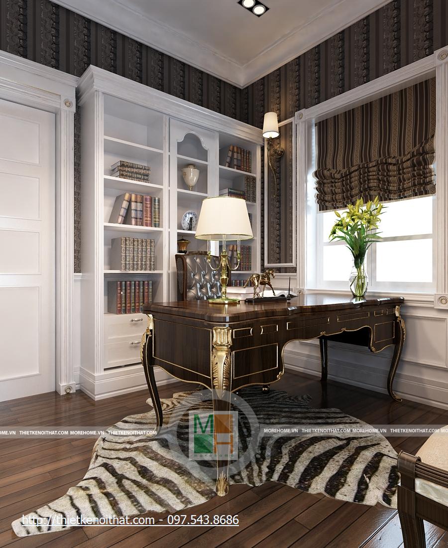 Phòng làm việc được thay đổi hoàn toàn với một tông màu trầm hoàn toàn khác biệt. Bàn ghế và sàn gỗ màu nâu sẫm, những mảng tường cũng được trang trí hoa văn cùng màu. Căn phòng trở nên ấm cúng hơn, dễ tập trung khi làm việc hơn. Bàn làm việc được đặt ở giữa phòng, cạnh đó là kệ sách lớn màu trắng nổi bật. hai bên nó là kệ đặt bình hoa, khiến cho căn phòng vốn có nhiều màu trầm trở nên có sức sống hơn. Cửa sổ chính khá lớn, hướng ánh sáng tự nhiên để căn phòng không bị tối vì quá nhiều màu trầm.