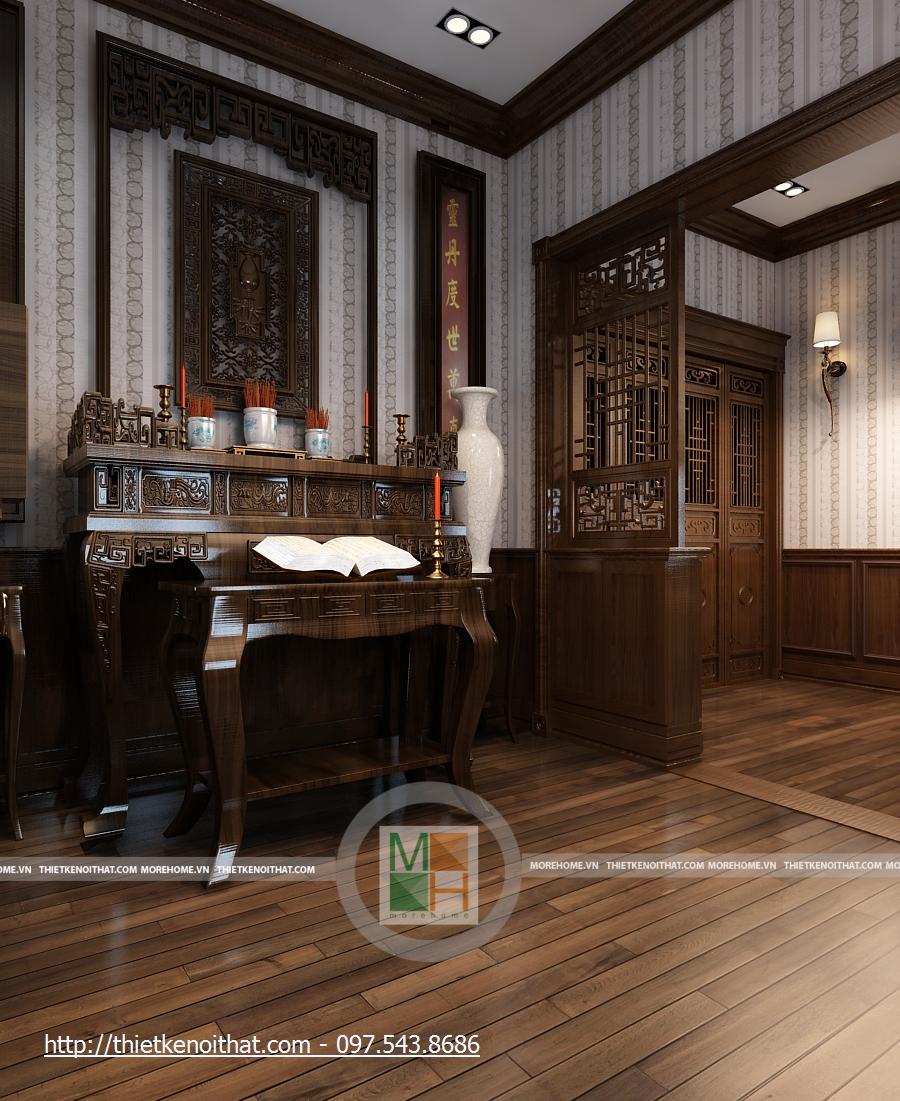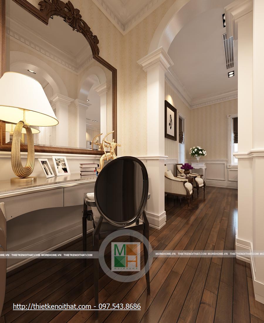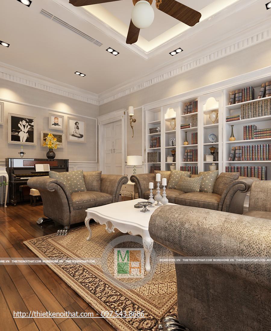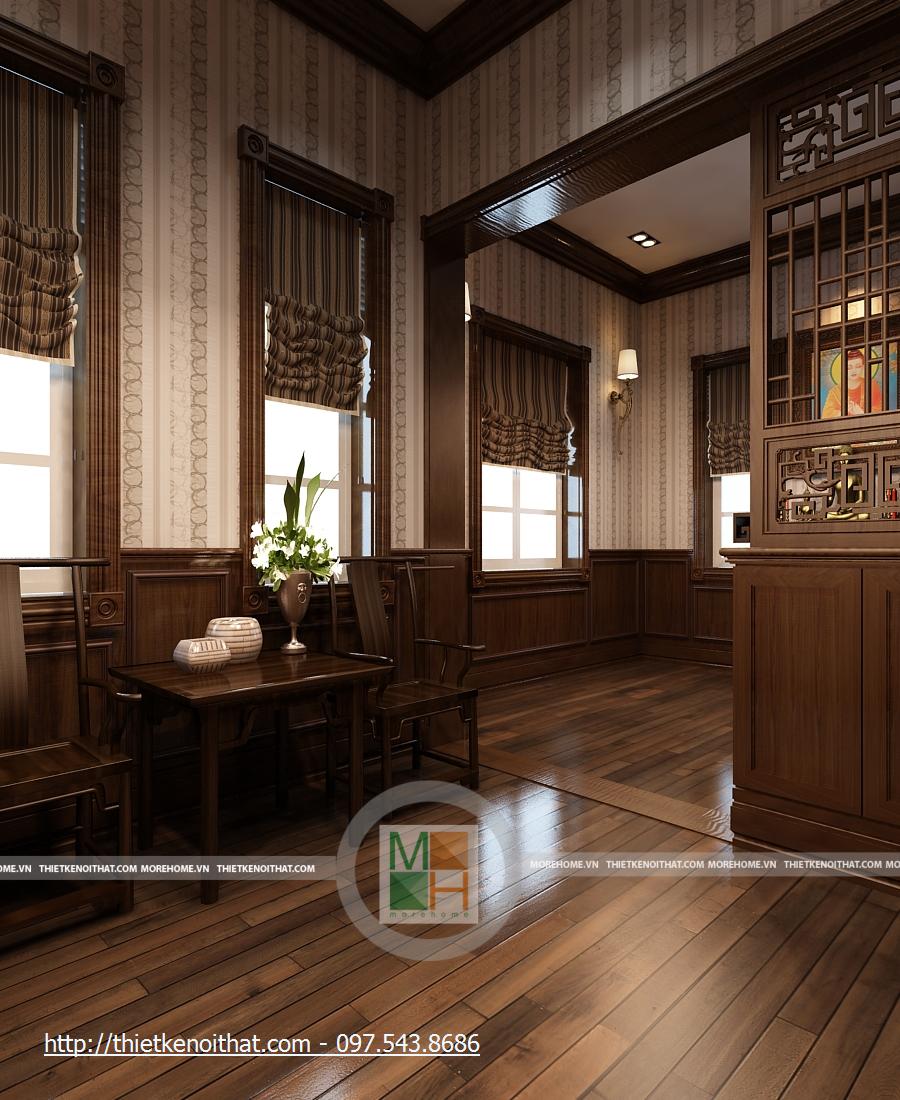 Phòng làm việc được thay đổi hoàn toàn với một tông màu trầm hoàn toàn khác biệt. Bàn ghế và sàn gỗ màu nâu sẫm, những mảng tường cũng được trang trí hoa văn cùng màu. Căn phòng trở nên ấm cúng hơn, dễ tập trung khi làm việc hơn. Bàn làm việc được đặt ở giữa phòng, cạnh đó là kệ sách lớn màu trắng nổi bật. hai bên nó là kệ đặt bình hoa, khiến cho căn phòng vốn có nhiều màu trầm trở nên có sức sống hơn. Cửa sổ chính khá lớn, hướng ánh sáng tự nhiên để căn phòng không bị tối vì quá nhiều màu trầm.