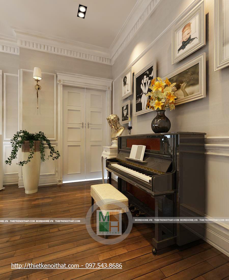 Sảnh tầng 3. Ở đây, nội thất được thiết kế khác đặc biệt với từng đôi ghế đi với một chiếc bàn nhỏ. Ghế được thiết kế kiểu cổ điển với chân nhỏ thấp, màu sắc hài hòa với màu gỗ của sàn nhà. Sự ấm cúng đến từ màu gỗ và màu vàng của đèn tường, đèn trần. Ngoài ra, căn phòng vẫn có đủ ánh sáng tự nhiên từ 2 ô cửa sổ được thiết kế đối xứng cạnh chiếc piano. Sự có mặt của chiếc piano đã khiến cho căn phòng trở nên sang trọng hơn.