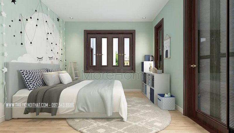 Mẫu giấy dán tường phòng ngủ có hình bầu trời sao đẹp với tông màu xanh nhẹ nhàng.