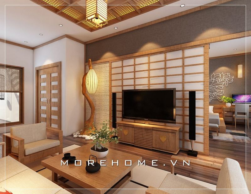 Trong thiết kế nội thất phòng khách chung cư, bạn có thể sử dụng cửa trượt để tạo ra một cửa ngăn đồng thời làm vách trang trí đẹp mắt, độc đáo với phong cách thiết kế nội thất sang trọng của Nhật Bản.