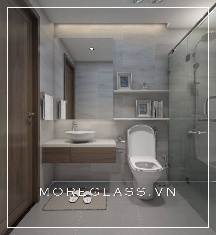 Sử dụng vách tắm kính cường lực để thiết kế nội thất phòng tắm, giúp ngăn chặn nước hắt ra ngoài và tối ưu hóa không gian.