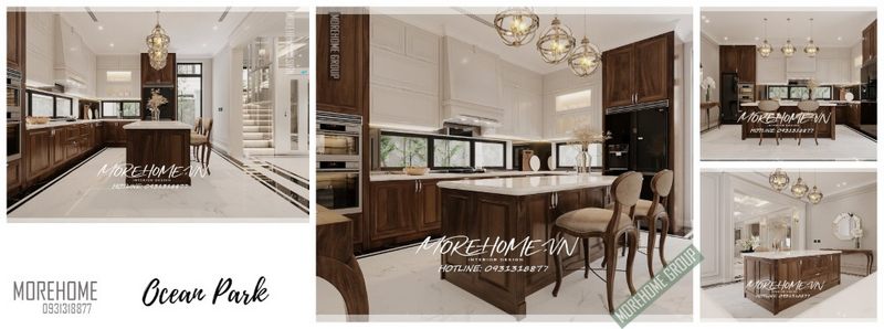 Không gian bếp được trang bị nội thất có hệ thống tủ bếp phối màu giữa sắc trắng ngọc trai và sắc nâu trầm, đường nét vân gỗ óc chó tự nhiên, chùm đèn kiểu dáng tinh tế độc đáo. Tất cả đó tạo nên một không gian tân cổ điển hoàn mỹ.